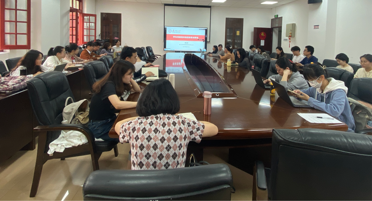 4月15日,中国语言文学系、历史与文化遗产学院、哲学系联合组织党务骨干参加厦门大学党委党校(第213期)学生党支部书记、副书记、委员党务工作能力提升班。本期培训班由校组织部/党建办、党委党校联合举办,旨在进一步提升全校学生党支部书记、副书记、委员政治素质和业务能力,推动学校基层党建工作再上新台阶。