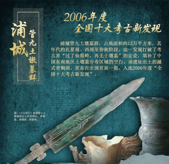 浦城历史悠久,2005年在仙阳镇下洋村的猫耳山窑群,发现夏商窑炉9座,出土大量黑衣陶和印纹陶;同年发现浦城土墩墓群40多座墓葬,出土陶器、青铜器、玉器等,反映了西周至春秋时期土墩墓发展演变的轨迹。这两项发现分别获2005年和2006年“全国十大考古新发现”。