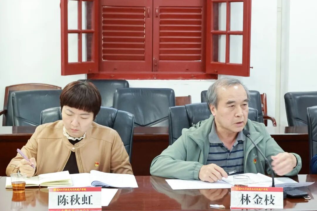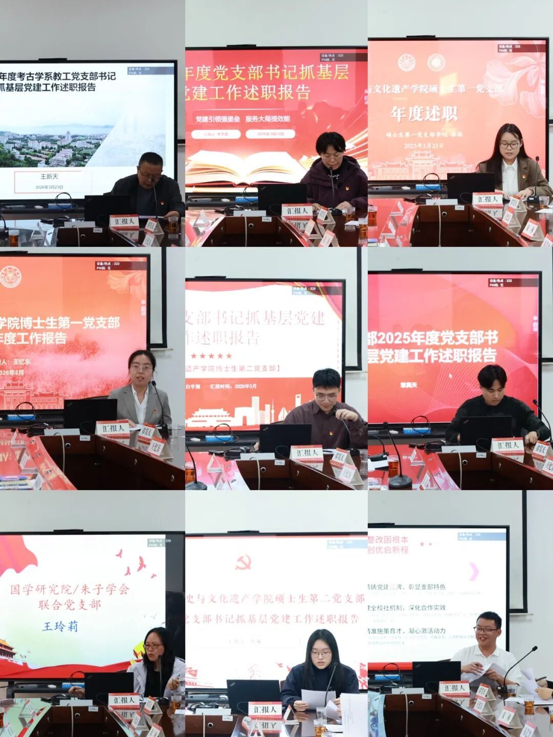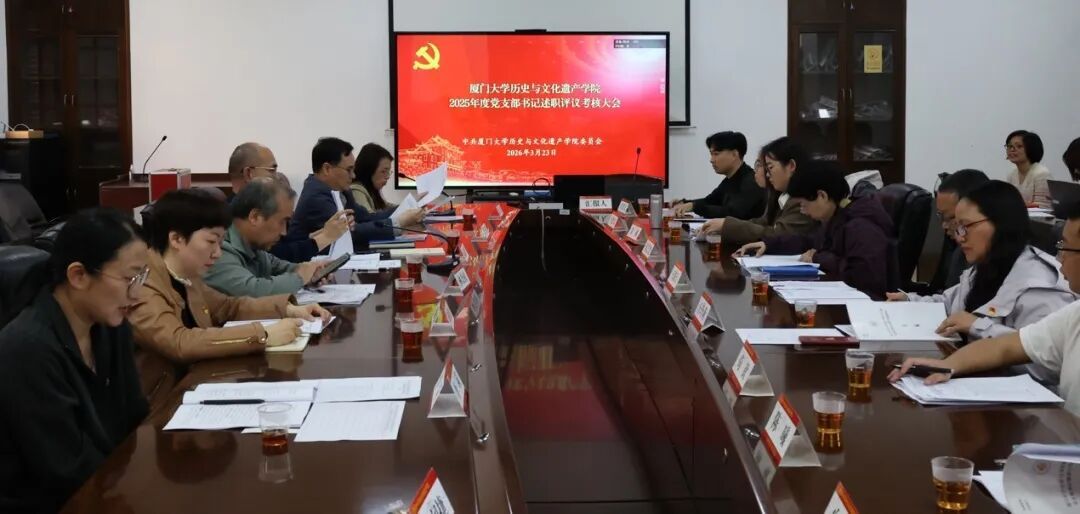 为落实党支部书记抓基层党建第一责任人职责,推动全面从严治党向基层延伸,促进述职评议考核常态化长效化,3月23日下午,历史与文化遗产学院召开2025年度党支部书记抓基层党建工作述职评议考核大会。厦门大学基层党建工作联络员林金枝、厦门大学党委组织员兼党建办副主任陈秋虹莅会指导,学院党委书记陈锦华,党委副书记、院长张侃,党委副书记张晗,副院长李莉、张闻捷,全院师生党支部书记、委员和党务秘书、辅导员等参加了会议。会议由张晗主持,以党委扩大会议形式进行。