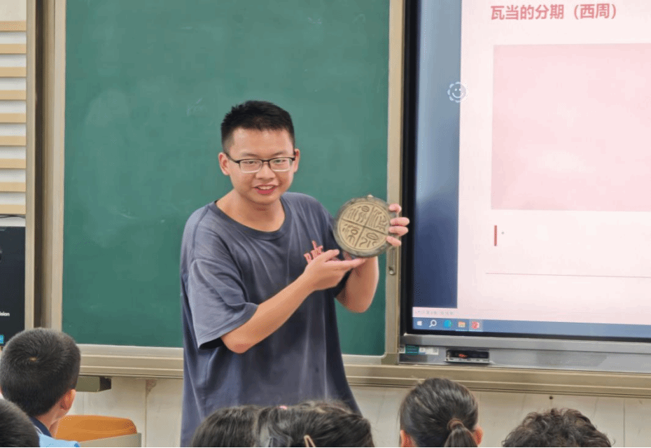 “瓦当是什么?”学院本科生党支部副书记苟钦同学以形象的比喻拉近孩子们与千年文物的距离,“瓦当就像是古代建筑屋顶的‘帽檐’,既能保护屋檐,也凝聚着古人的智慧与审美。”从云纹瓦当的飘逸灵动,到文字瓦当的庄重典雅,每一片瓦当都记录着古代社会的生活图景与艺术追求。同学们聚精会神,眼神中充满好奇,仿佛透过这些纹饰,触摸到了历史的脉搏