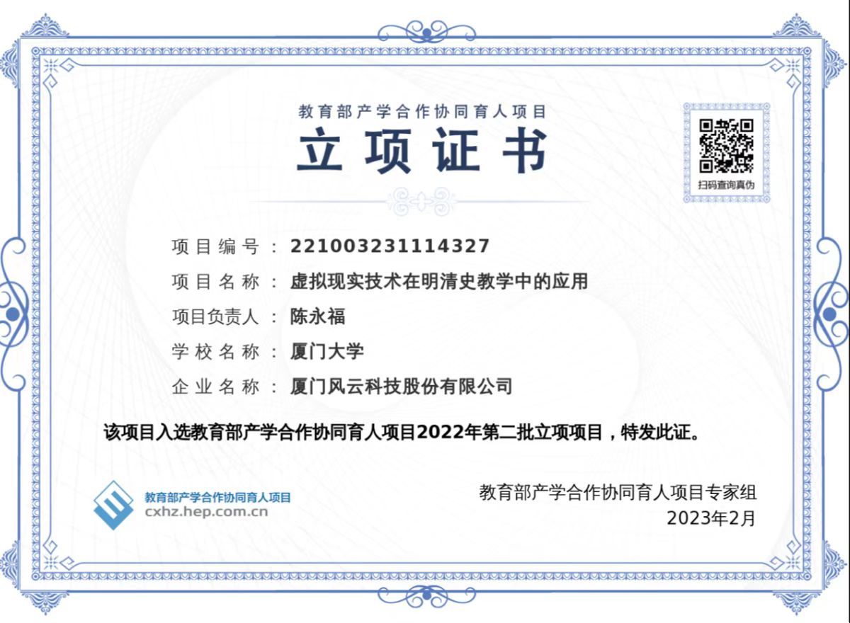 近日,教育部高等教育司公布了2022年第二批产学合作协同育人项目立项名单(教高司函〔2023〕1号),我院陈永福老师的“虚拟现实技术在明清史教学中的应用”项目获准立项。