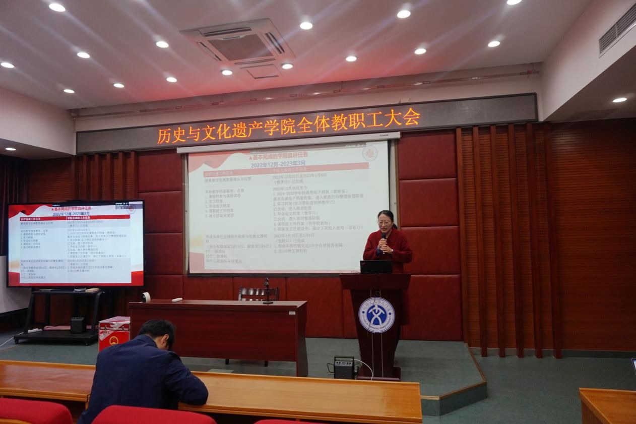 张侃院长作历史与文化遗产学院学科建设的工作报告。张院长分别分析了中国史、世界史与考古学学科的发展短板、重点建设与重点培育方向。他强调,学院必须要把握好学科调整的机遇,将学科传统转化为学科优势;各学科要提高忧患意识,增加高层次的学术研究成果产出。他希望全体教师增强学科建设的主动性,加强学术交流、注重人才培养,进一步提高学术研究水平;积极利用学校政策机制,扩大人员队伍。他强调,本科教育教学评估工作是今年的重要工作之一,希望全体教师能够积极配合,共同做好各项工作。