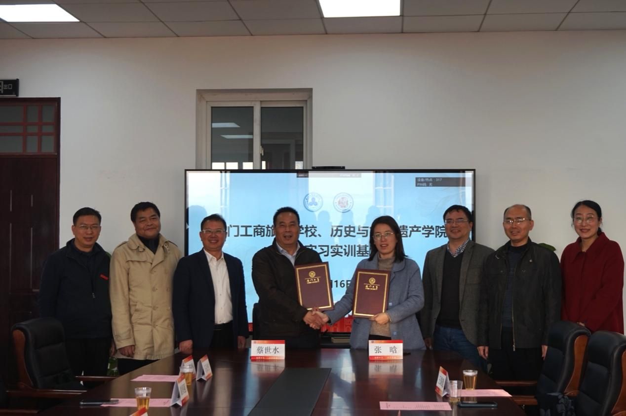 厦门工商旅游学校党委委员、副校长蔡世水同历史与文化遗产学院党委副书记张晗签署了《厦门大学历史与文化遗产学院 厦门工商旅游学校 共建实习实训基地协议书》。