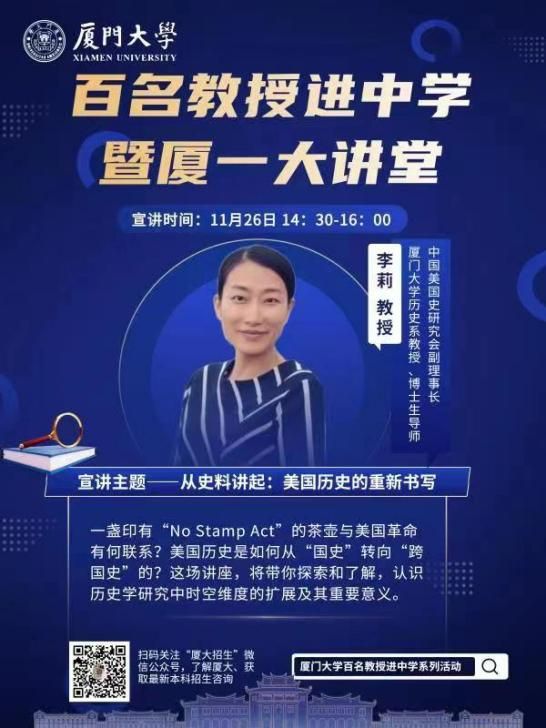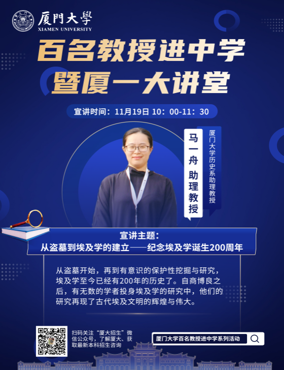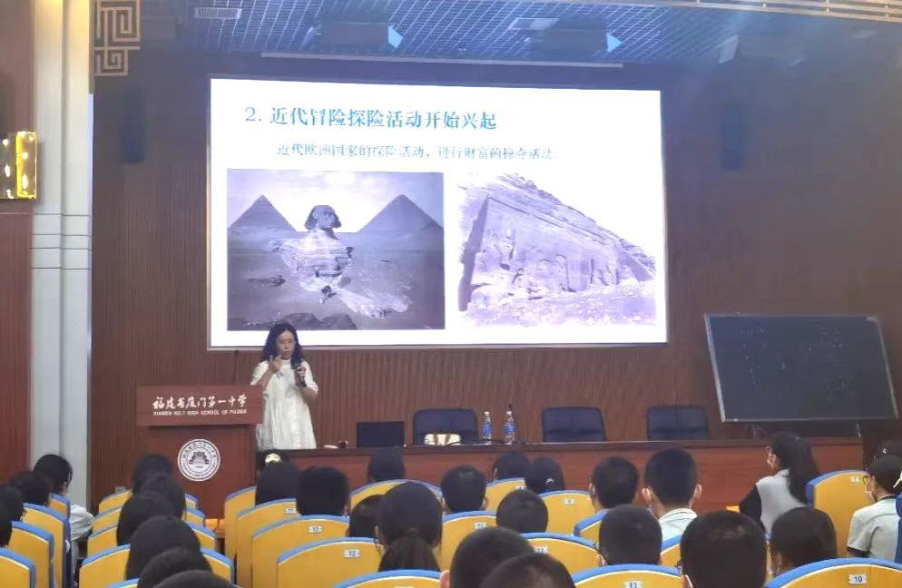 在我校与厦门市第一中学联合举办的“厦一大讲堂”系列活动中,2022年底,我院教授李莉、马一舟分别为一中学子送去了《从史料讲起:美国历史的重新书写》和《从盗墓到埃及学的建立——纪念埃及学建立200周年》两场讲座。