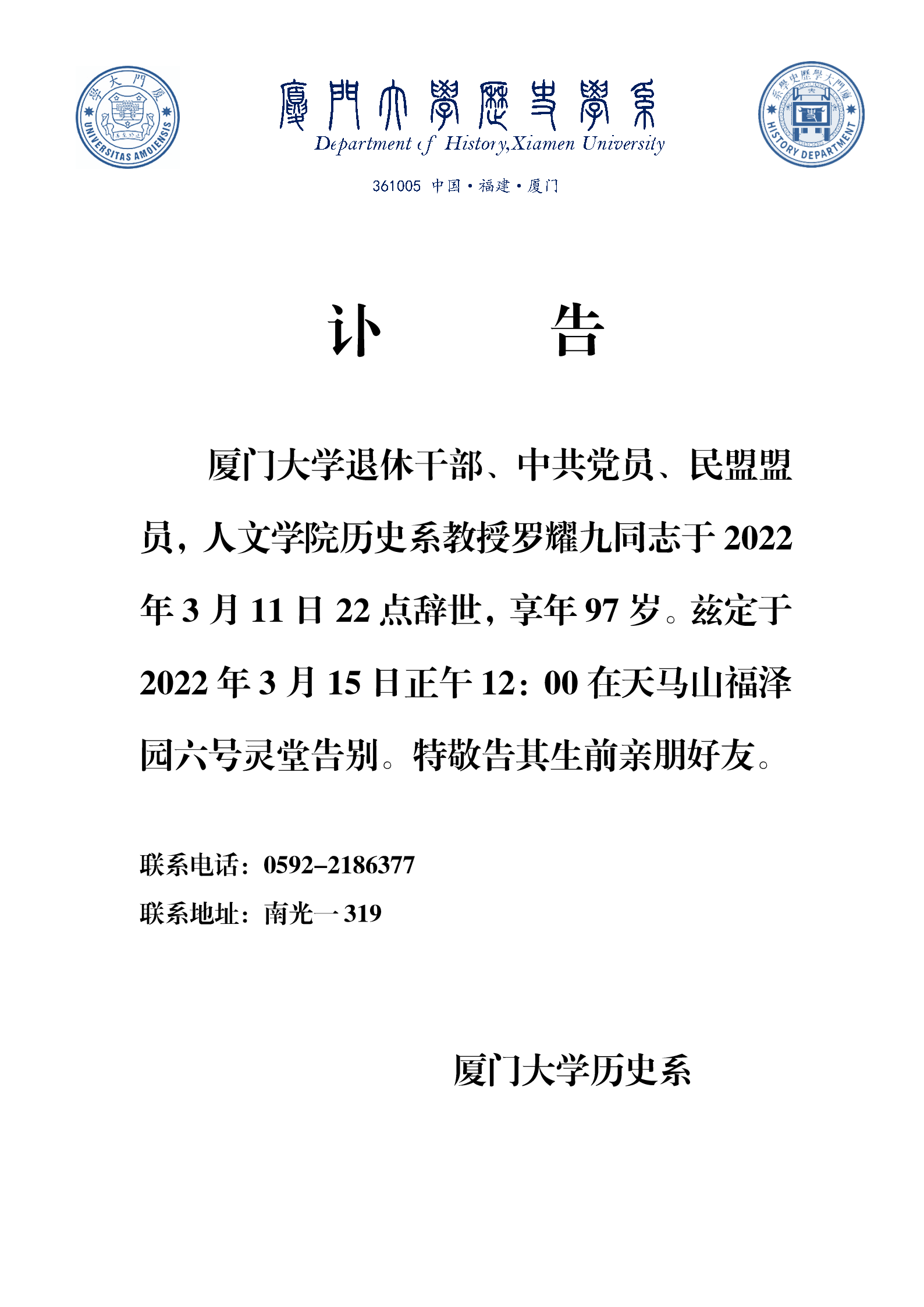 罗耀九教授,生于1925年8月3日,江西吉安人。1941年9月至1944年7月在吉安中学、吉安国立十三中学学习。1944年9月至1948年7月在南昌大学(原国立中正大学)历史系读书。1948年9月至1950年12月任厦门大学中国海洋研究所助理研究员。1951年1月至1952年1月任厦门大学南洋研究馆实习研究员。1952年2月调入厦门大学历史系任教,历任助教、讲师、副教授、教授。1980年3月任厦门大学历史研究所副所长。1951年5月加入中国民主同盟会,曾任厦门市临时工作委员会宣委会委员,厦门大学总支副主委。1988年9月29日光荣加入中国共产党。1991年6月荣休。兼任福建省历史学会厦门分会秘书长、副会长、会长,福建省严复学术研究会副会长,厦门吴真人研究会会长。享受国务院政府特殊津贴。