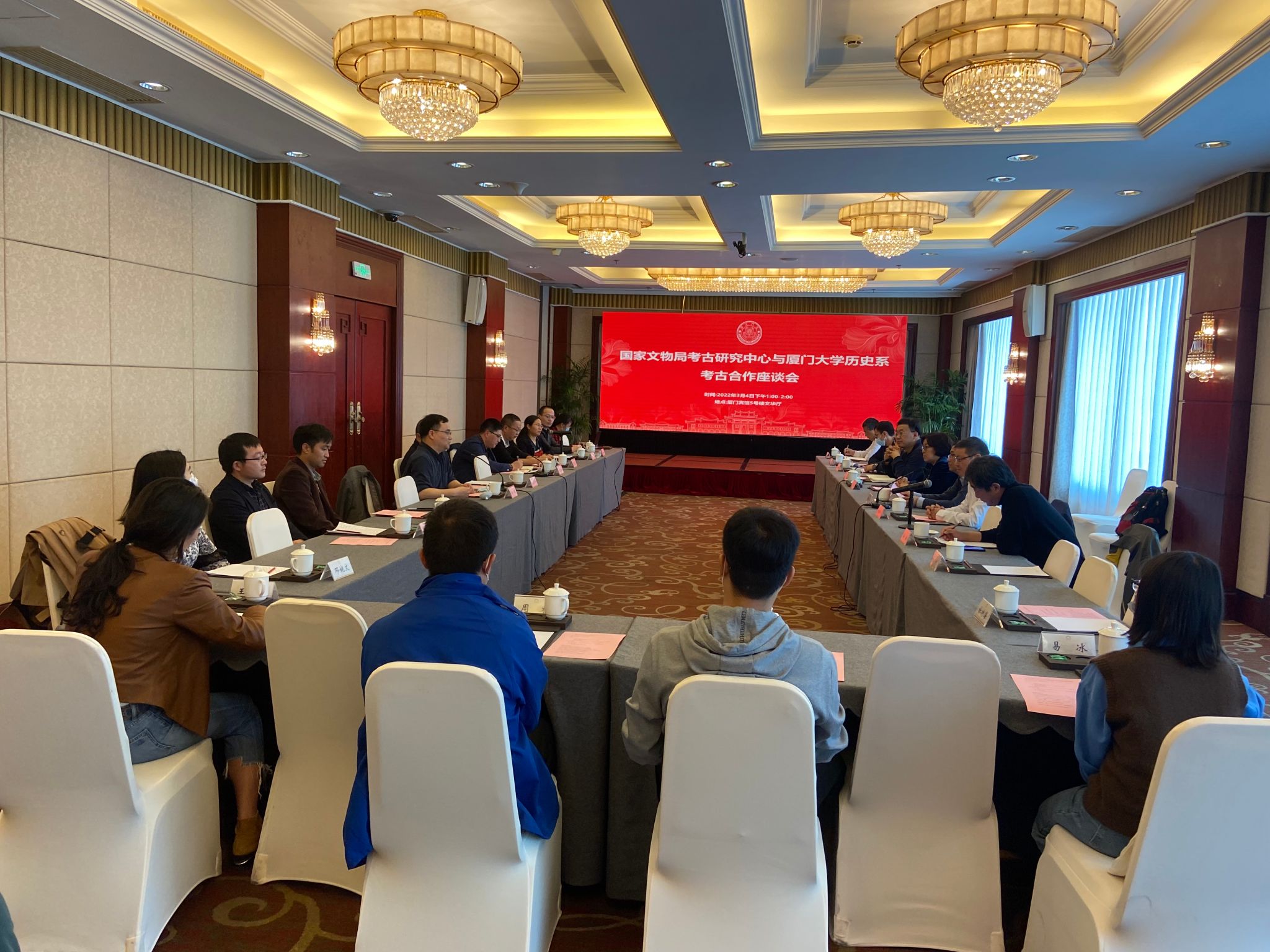 2022年3月4日下午,国家文物局考古研究中心主任唐炜带队来厦调研我校考古学科建设情况,并商谈海洋考古合作相关事宜。座谈会在厦门宾馆文华厅举行,由厦门大学历史系主任张侃主持。厦门大学人文学院党委书记高忠华、厦门大学社会科学研究处副处长张随刚出席座谈会。