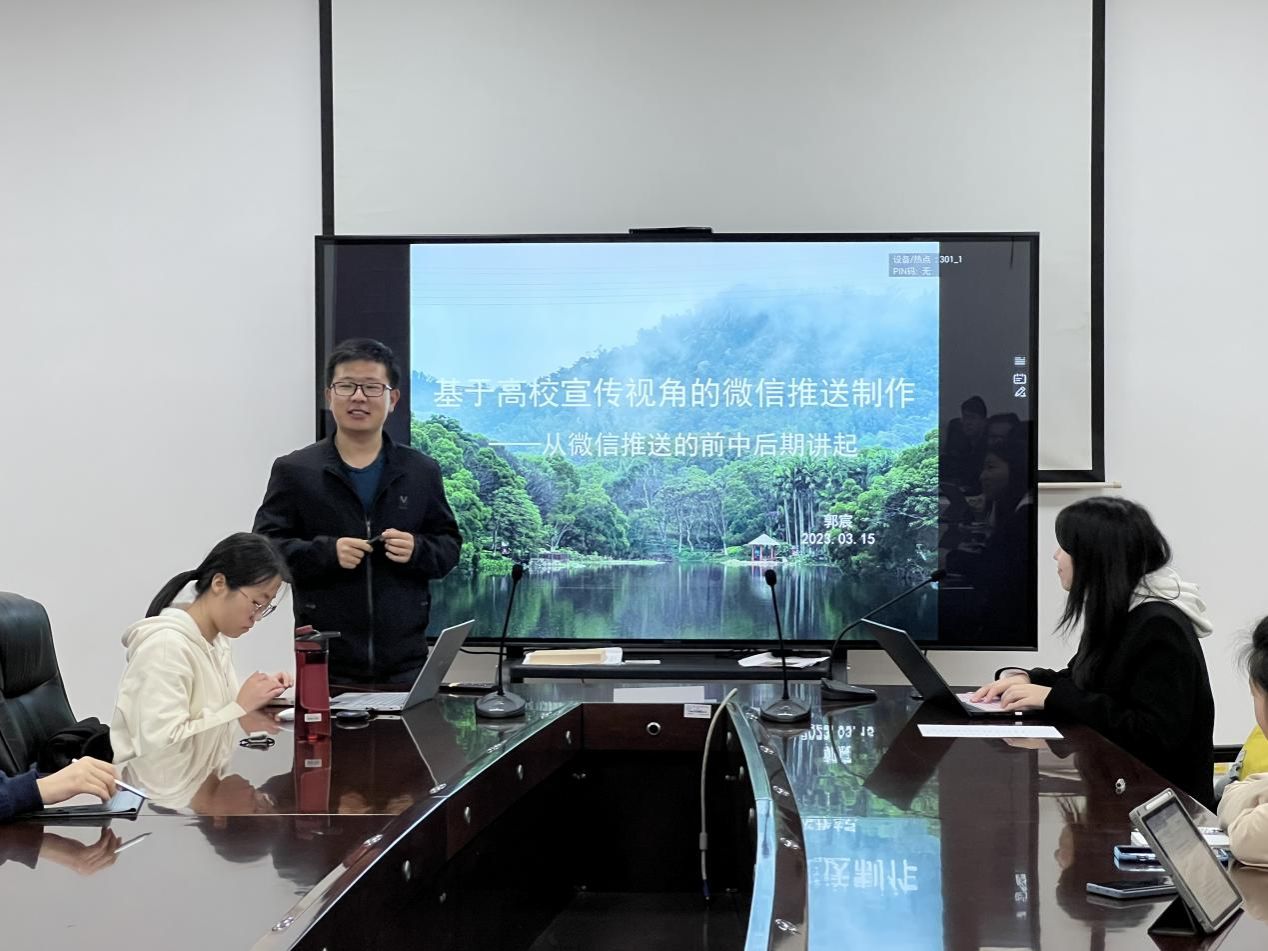 会上,郭宸表示要多思考“为谁传播”“传播给谁”“传播什么”“怎么传播”四个问题,明确平台定位,关注受众群体,牢记宣传初心,做有内容、有深度、有温度的宣传。他全面详细又生动形象地向大家分享了自己的宣传工作经验,围绕选题与采编、写作与编辑、校对与传播三个方面展开。
