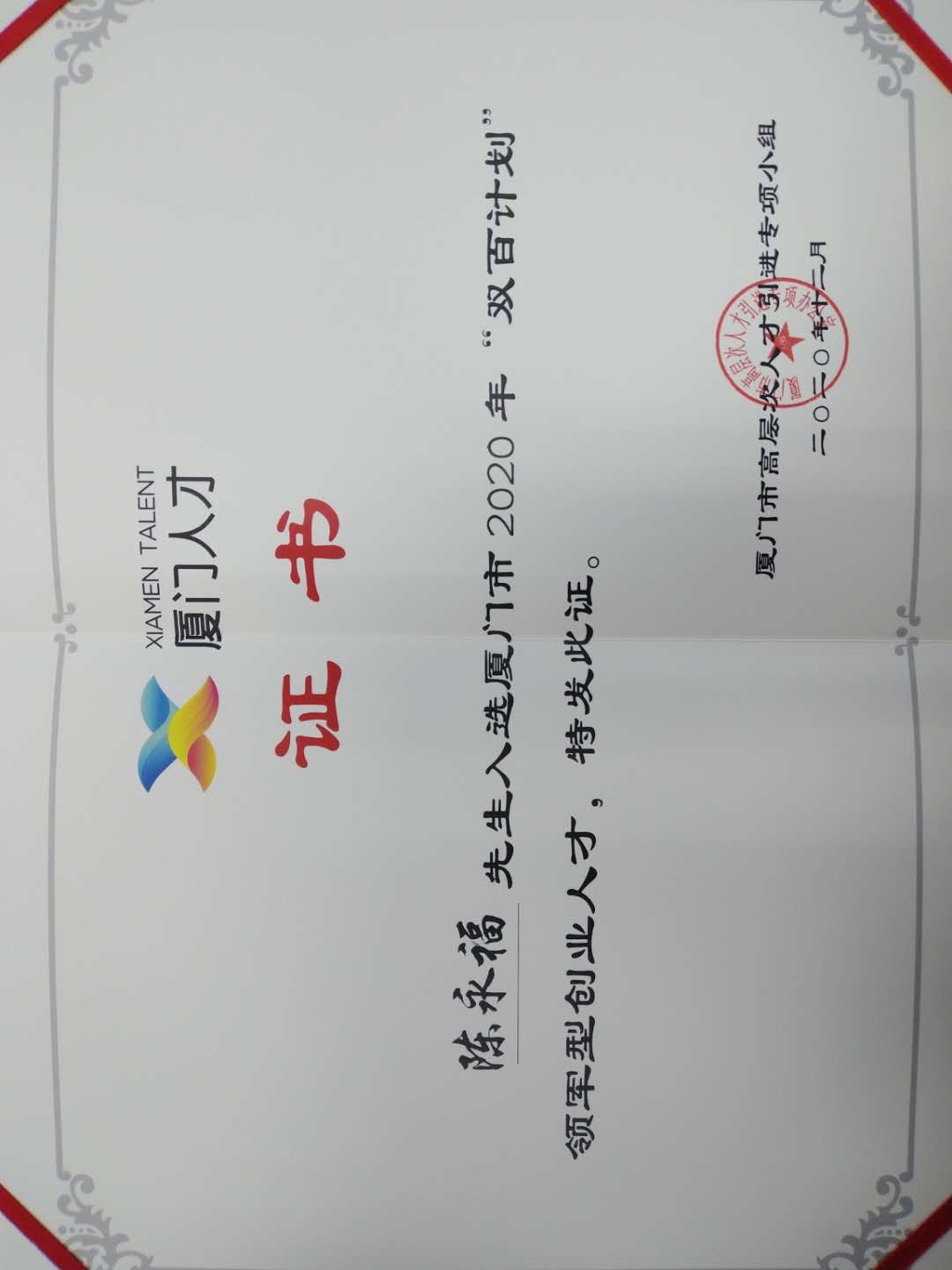根据厦门市高层次创新人才和领军型创业人才“双百计划”实施意见(厦委组〔2020〕33号),经申报、初审、网络评审、现场答辩、实地考察、市高层次人才引进专项小组会议研究等程序,厦门市高层次人才引进专项小组公布了《关于印发2020年引进高层次人才“双百计划”人选名单的通知》,我系陈永福老师入选厦门市第十三批引进高层次人才“双百计划”领军型创业人才。此次共有47人入选“双百计划”,其中7人入选“双百计划”高层次创新人才,40人入选“双百计划”领军型创业人才。最高可得1000万元以上扶持金额。