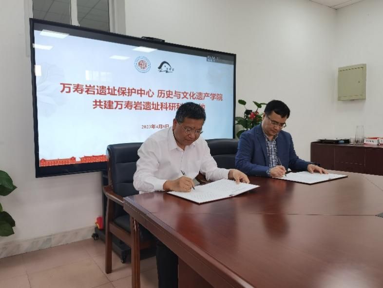 李顺亮与张侃分别代表万寿岩遗址保护中心和历史与文化遗产学院,签署双方共建万寿岩遗址科研科普基地合作协议。与会嘉宾合影留念。