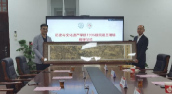 建发国旅集团总经理、万千研学公司董事长、历史与文化遗产学院1996级院友王珺瑜,向学院捐赠非遗工艺“清明上河图”精美剪纸画。陈锦华书记主持捐赠仪式。随后,与会嘉宾合影留念。