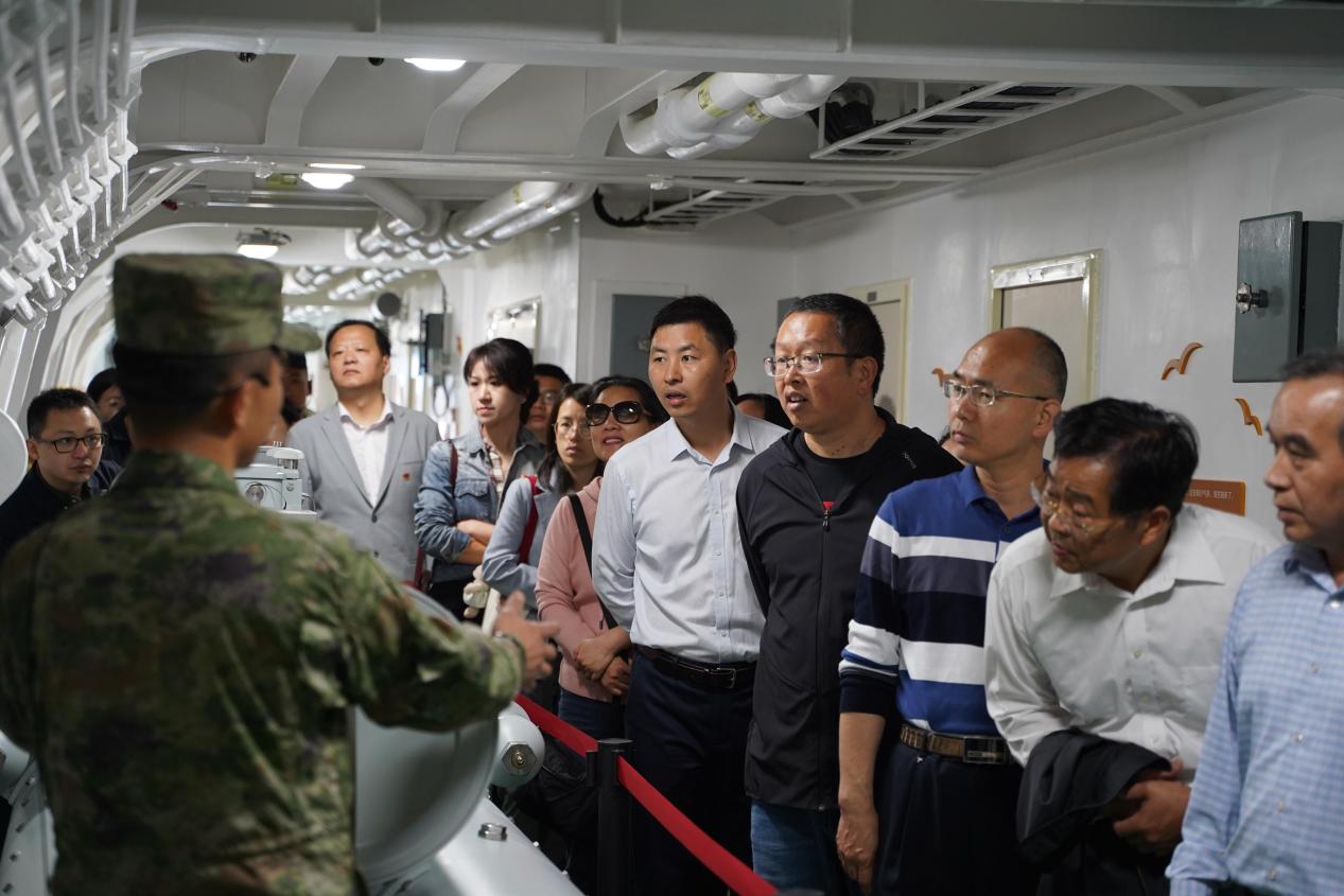 习近平总书记强调:“要进一步关心海洋、认识海洋、经略海洋,推动我国海洋强国建设不断取得新成就。”在舰艇的会议室中,师生和官兵代表们围绕海洋强国交流研讨、碰撞思想。交流中,矫正坤政委结合自身经历,讲述了海军战士维护国家利益至上、不怕流血牺牲、海军使命必达的生动故事。历史与文化遗产学院历史学系教工党支部书记陈博翼副教授介绍了甲午海战的历史,用详实的数据和史料从历史出发,重新思考海洋强国的战略,以史为鉴、勇毅前行。艺术学院党委副书记刘晓峰以“向海图强 与国同梦”为题,分享了对《习近平谈治国理政》《习近平著作选读》等著作中有关军队建设重要论述的学习心得。