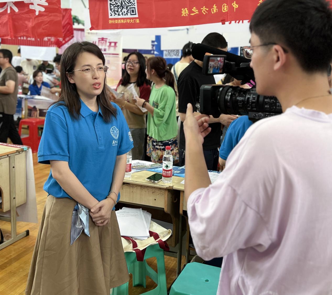 两个学校体育馆里人山人海,一波又一波的考生和家长挤在厦门大学的咨询点前,咨询报考事宜。三位老师一边向考生和家长分发报考指南等材料,一边耐心解答各个问题,不仅分析考分位次、专业选择,还畅想校园生活、规划职业生涯。义乌市融媒体中心专门采访了张晗副书记,对厦门大学的招生宣传工作做了报道。
