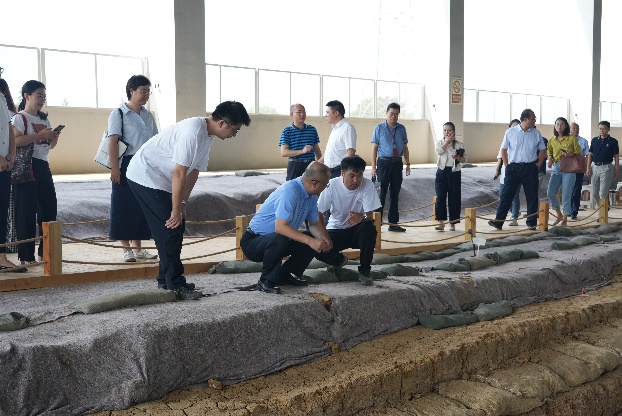 林东伟一行首先来到武王墩一号墓发掘现场。在武王墩一号墓墓坑旁,了解主墓封土、填土和椁室的发掘工作。历史与文化遗产学院副院长、武王墩墓考古发掘项目考古一组组长张闻捷教授详细讲解了墓主的身份、墓葬的结构、夯土的特点、出土的文物和外围陪葬墓等情况,帮助大家深入了解墓葬考古发掘工作。