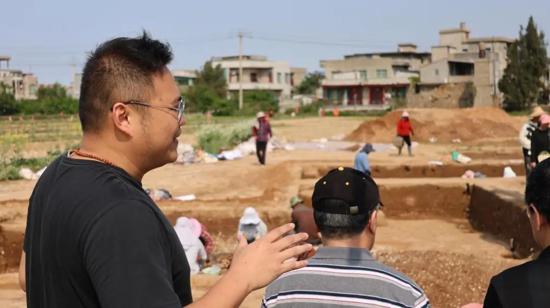 队伍首先抵达西营遗址。厦大考古学系系主任付琳介绍,该遗址是壳丘头遗址群的重要组成部分,构建了东南沿海距今7500至3000年前的文化序列,为南岛语族起源与扩散研究提供关键证据,入选“2023年度全国十大考古新发现”。付琳重点指出,西营遗址出土的陶器形制与台湾大坌坑文化高度相似,印证两岸先民在新石器时代已共享文化基因。