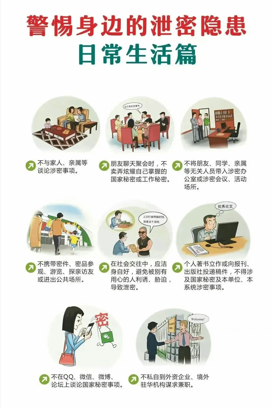 在日常生活中也要常备警惕心,不和亲人、朋友、同学谈论机密事项。与人交往要洁身自好,避免被有心人利诱、胁迫,导致泄密。