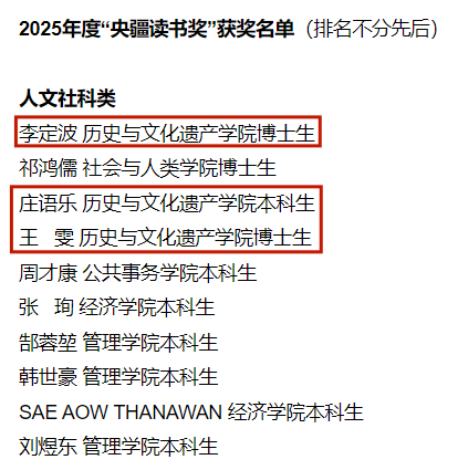 近日,经厦门大学图书馆初选、各院系推荐、评审委员会评议,2025年度“央疆读书奖”名单公布,我院博士生李定波、王雯及本科生庄语乐(排名不分先后)获奖。