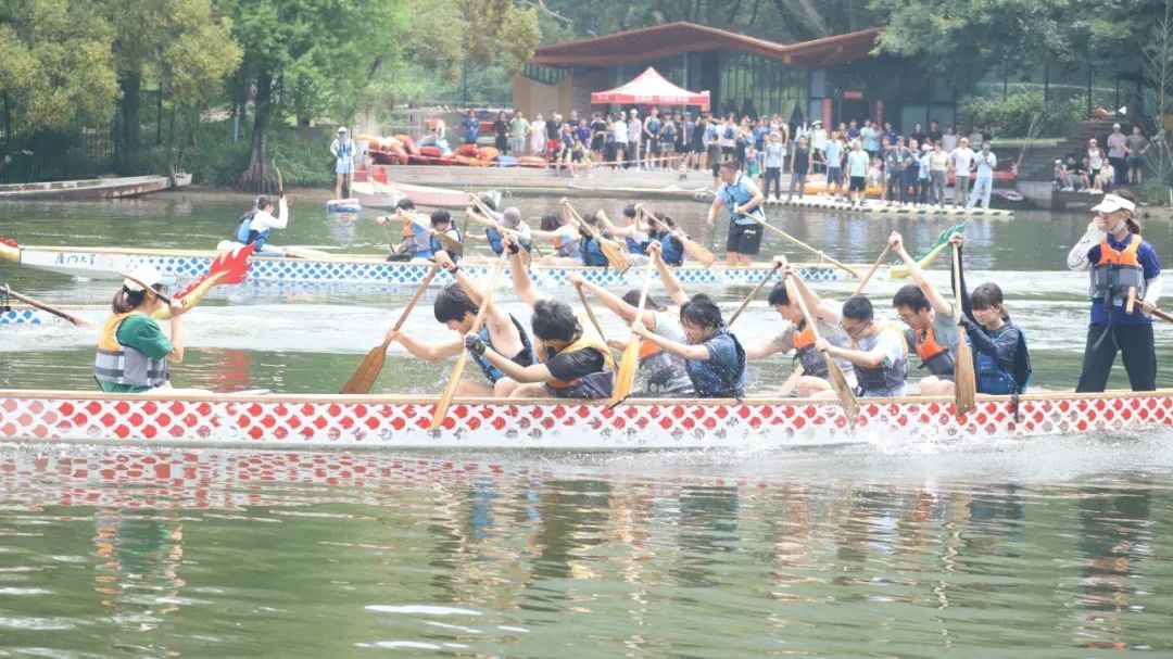 在5月10日上午的比赛中,龙舟竞渡率先进行。我院本硕学生共同组成的鉴古驭浪队和由硕士生组成的顺利毕业队的队员们整装待发,士气高昂。发令枪响,队员们在阵阵鼓声中,有条不紊地前进,湖水荡漾出热情而有力的水波。