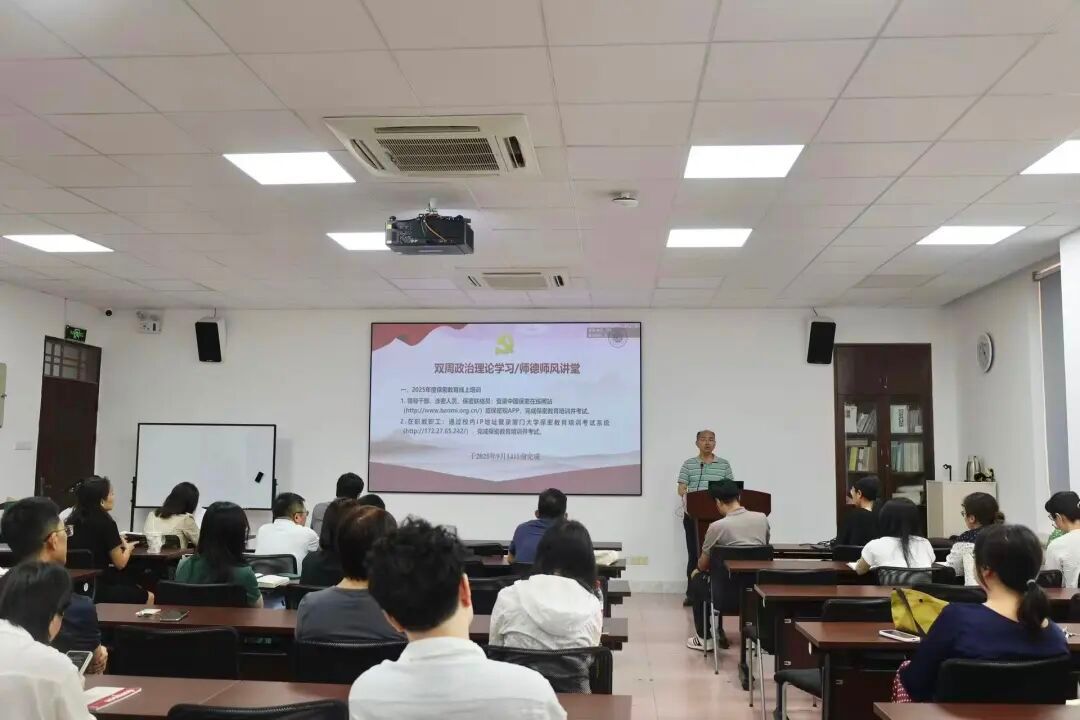 在第41个教师节即将来临之际,学院开展双周政治理论学习暨师德师风讲堂。院党委书记陈锦华首先开展了保密教育,强调要切实增强保密意识和责任感,加强保密知识学习,认真完成2025年度保密教育线上培训,完成互联网设备自查,不断提升保密业务能力,及时发现和消除泄密隐患,共筑保密安全屏障。随后,陈锦华传达了学校师德教育有关要求,强调师德教育实践的重要性,希望全体教师要以教育家精神为引领,以德立身、以德立学、以德施教,争做“四有”好老师,当好学生的指导者和引路人。