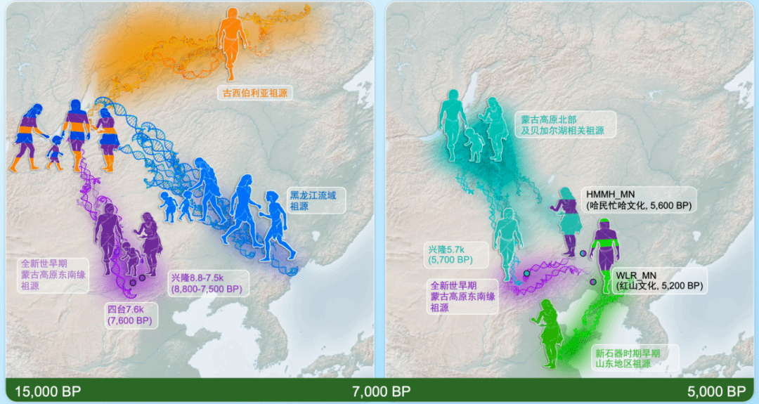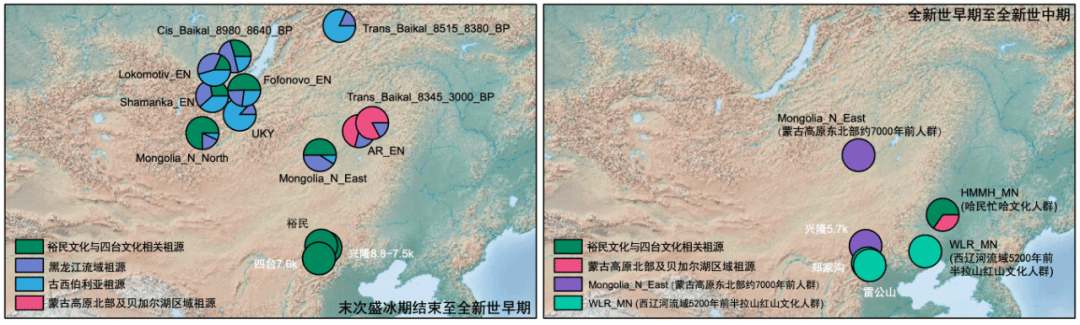 裕民文化和四台文化人群所代表的蒙古高原东南缘祖源还成为东北亚地区后期诸多文化人群的直接来源自旧石器时代末期至新石器时代中期,蒙古高原东南缘与蒙古高原北部、环贝加尔湖区域及西辽河流域等地之间持续存在遗传交流。蒙古高原东南缘祖源在距今1.4-1.1万年前对贝加尔湖及蒙古高原北部人群均有遗传贡献,与细石叶技术广泛扩散年代一致表明跨蒙古高原的人群流动推动了细石叶技术的传播。这一祖源对西辽河流域新石器时期中期的哈民忙哈文化和红山文化也有重要遗传贡献,可以证明蒙古高原东南缘是多支后期文化人群的直接来源地。距今约5,700年前,蒙古高原东南缘人群遗传连续性被来自蒙古高原东北部距今约7,000年前人群所打破,并与兴隆遗址同时期的文化变革相吻合,表明考古文化剧变伴随显著人群更替。蒙古高原东南缘距今约5,000年前的郑家沟、雷公山人群在文化与遗传上均与红山文化高度一致,说明红山文化晚期向西南扩散亦伴随着显著迁徙。这些发现实证了蒙古高原东南缘居于连接周边人群往来、文化互动的枢纽地位。