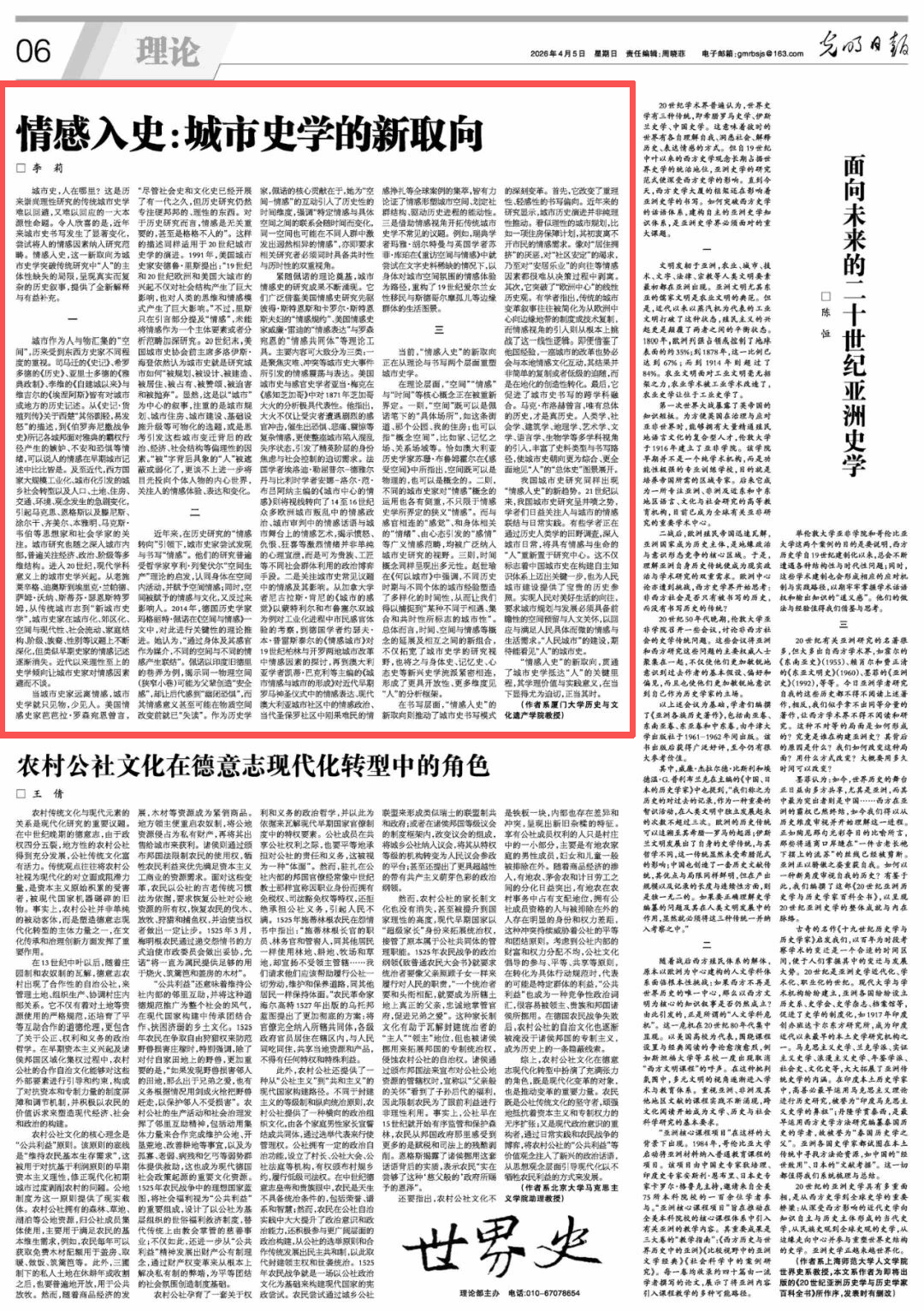 4月5日,我院李莉教授在《光明日报》理论版发表文章《情感入史:城市史学的新取向》。文章提出,“城市史,人在哪里”是历来崇尚理性研究的城市史学难以回避、又难以回应的一大命题,而近年来“情感入史”的新取向有助于解答这一命题。