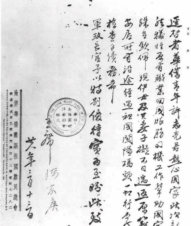 图5 1939年3月13日,陈嘉庚先生介绍南侨机工许志光回国服务的信函
