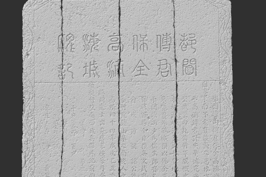 该碑作为记录地方先贤功绩的重要遗存,表面存在部分纹饰剥落、文字磨损的情况。借助微痕扫描技术的高精度捕捉能力,团队完整还原了碑刻的文字布局与纹饰细节,所生成的电子拓片与三维模型为后续的研究、展示与修复提供了科学依据。