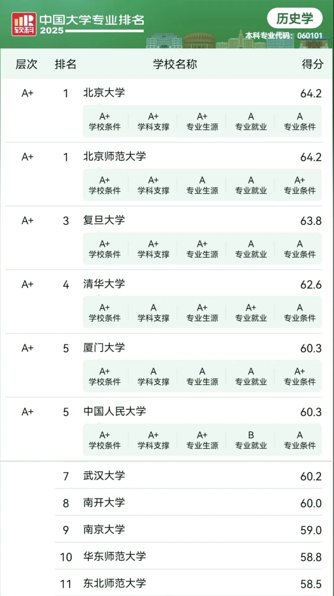2025年6月18日,高等教育专业评价机构软科正式发布“2025软科中国大学专业排名”,历史学专业排名第5(并列),进入A+,考古学专业排名第12,进入B层次。