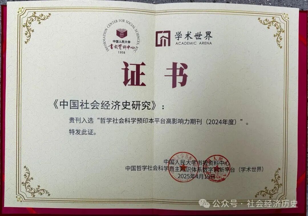 2025年4月19日,2025年复印报刊资料转载指数发布暨预印本平台建设论坛在中国人民大学召开。《中国社会经济史研究》入选2024年度哲学社会科学预印本平台高影响力期刊50强名单。