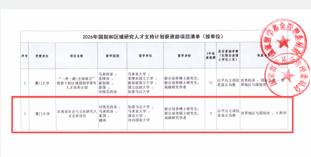 2025年12月,国家留学基金委公布了2026-2028年“国别和区域研究人才支持计划”资助项目。历史与文化遗产学院和社会与人类学院联合申报的“东南亚社会与文化研究人才支持项目”获得三年滚动支持,这是该项目继2022-2024、2025-2026前两期成功实施之后再次获得资助。