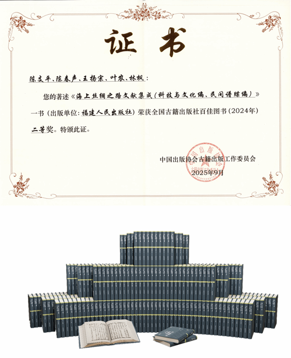 2025年9月,由厦门大学历史与文化遗产学院陈支平教授、中山大学陈春声教授共同担任总主编,厦门大学历史与文化遗产学院林枫教授担任主编的《海上丝绸之路文献集成·民间谱牒编》入选2024年度全国古籍出版社百佳图书推荐名单,并获全国古籍出版社百佳图书二等奖。11月,《海上丝绸之路文献集成·民间谱牒编》入选第二十七届(2024年度)华东地区古籍类优秀图书推荐名单,并荣获古籍类优秀图书一等奖。
