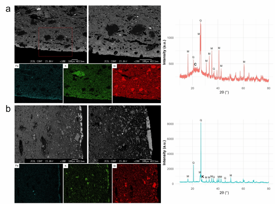 对应元素Fe、K、Si分布图及胎体XRD谱