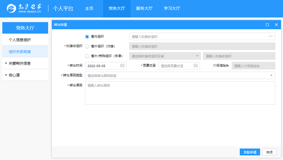 2.福建省内(不含厦门市)党员申请转入。党员登录“党员e家”平台(www.dyejia.cn)→点击“登录”→登录个人平台→进入“党务大厅”→选择“组织关系接转”→点击“申请”→选择“省内组织”→填写拟接收党支部名称(同上)→填写“转出时间”→填写“党费交至”时间→填写“转出原因类型”→填写“转出原因”→点击“发起申请”。即可发起在线转接流程,提交后由各级党组织管理员进行在线审批。党员要提醒转入单位及时办理和确认网上审批程序。