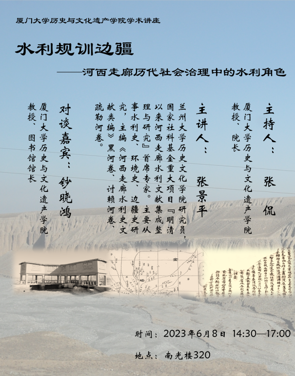 河西走廊是中国著名地理单元,自西汉以来即是干旱区灌溉农业发达的代表区域之一,亦曾长期处于边疆地位。两千多年来的水利开发活动,不仅始终构成河西走廊社会经济活动开展的前提,更作为一种重要的治理活动不断为边疆社会提供着技术、制度乃至思想资源。汉晋简牍、敦煌文书以及新发现整理的近世水利文献,为史学工作者观察历代水利活动的微观运作提供了难得的长时段文献序列。本次演讲将围绕环境与技术造就的“超稳定”水利秩序、水利组织与其他社会治理结构的关系、水利治理功能的“溢出效应”等主题,扼要揭示西汉至中华人民共和国时期水利活动对于河西走廊社会的巨大形塑作用,并就如何综合生态、技术与社会视角深入理解西北边疆历史提出若干思考。