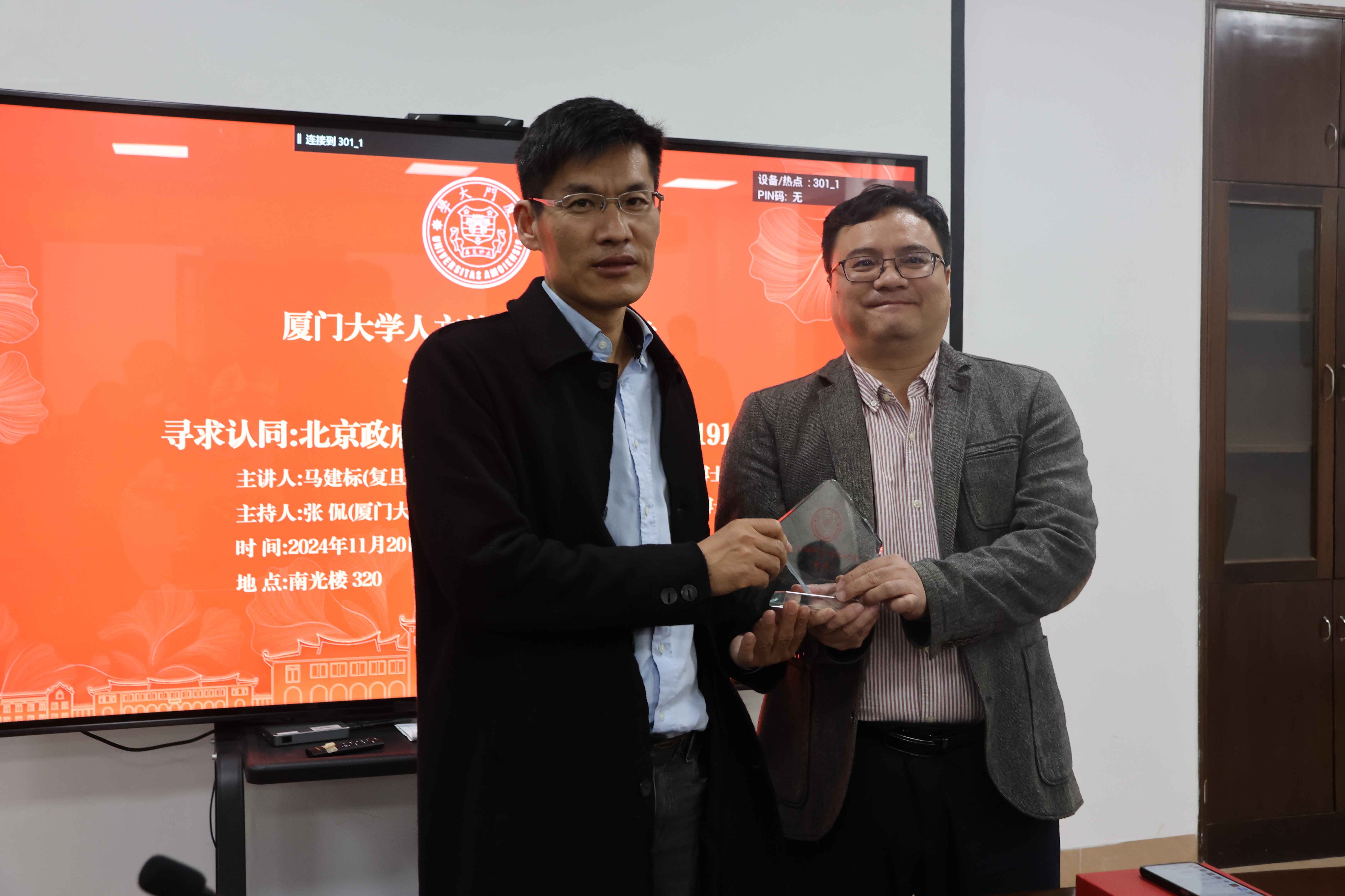 讲座开始前,张侃院长代表学校为马建标教授颁发“厦门大学人文社科至善大讲堂”纪念牌。