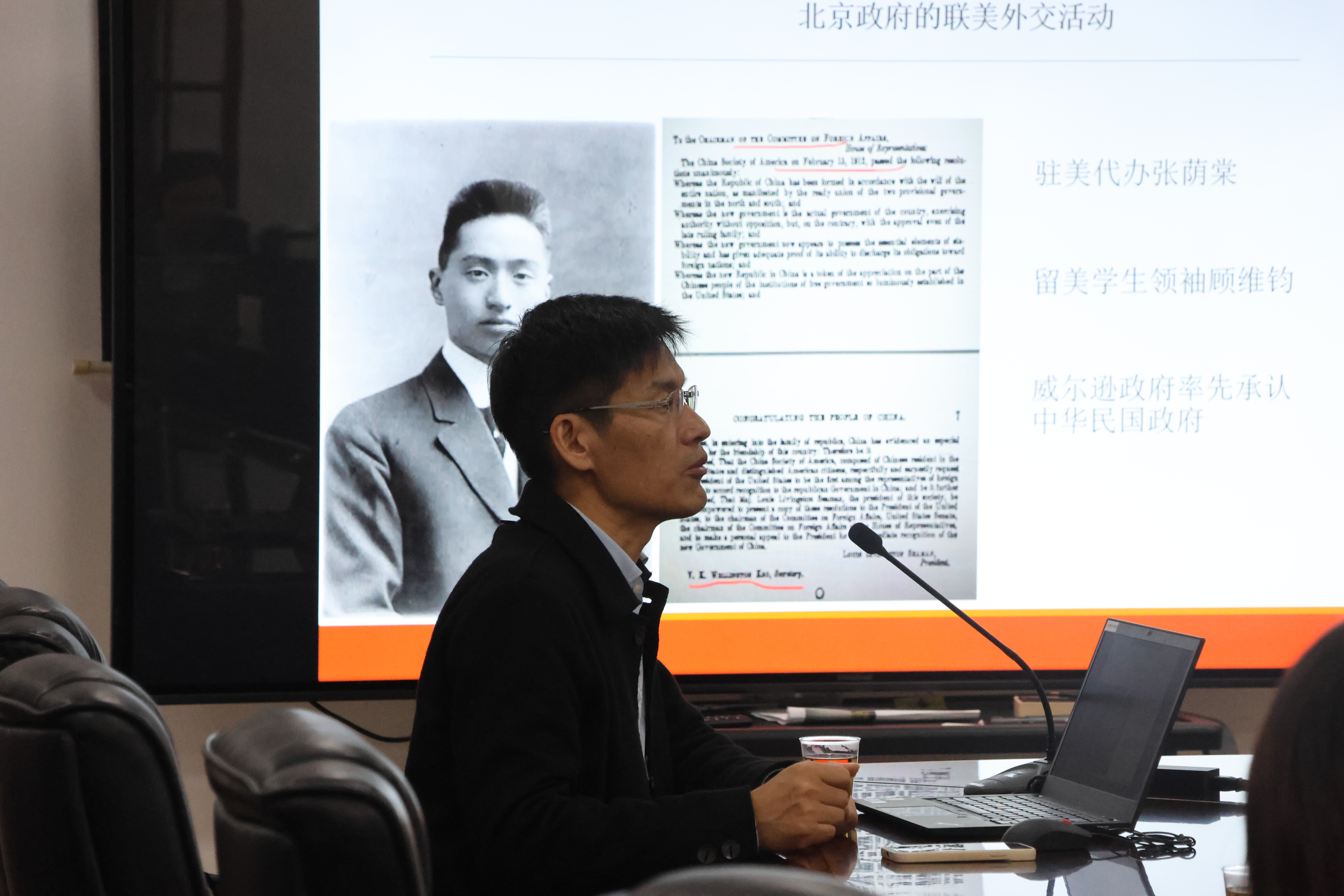 进一步地,教授深入浅出地讲述了1912∽1913年间北京政府的“祈祷外交”策略与运作机制,并指出这一段史实得到重新发掘的重要价值。为了佐证观点,并使同学们增进对主题的了解与思考,马教授陈列了大量珍贵档案图片,且对顾维钧为代表的民国对美“游说”群体作了重点阐释。