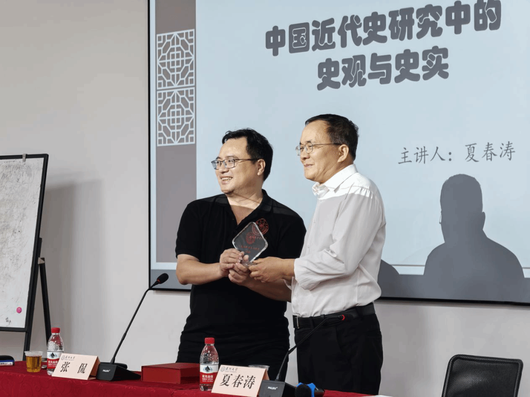 讲座前,张侃院长代表学校向夏春涛所长颁赠 厦门大学人文社会至善大讲堂纪念牌