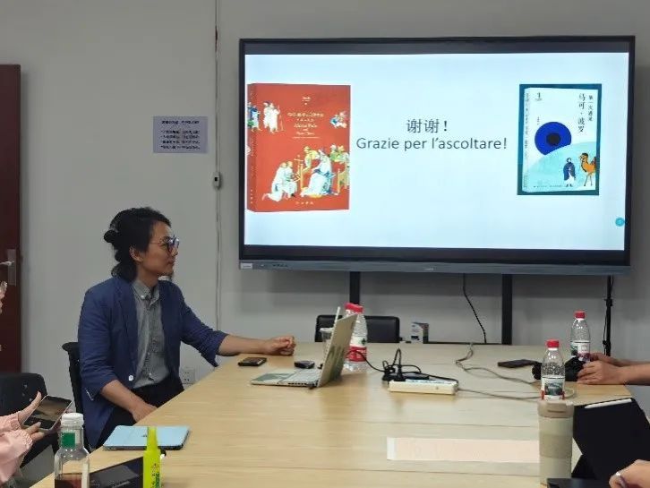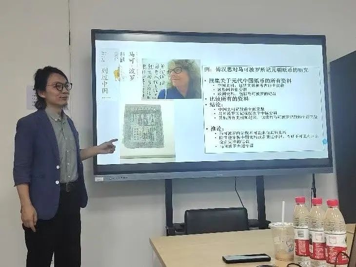 第二部分标题为“语言:多语种史料的译介”。马老师介绍:自19世纪末以来,学者使用的史料底本语言呈现多元化趋势。如今研究可使用的底本包括:张星烺以贝内代托英译本为底本的汉译本,冯承均以沙海昂法译本为底本的汉译本,以及英译百衲本、高田英树日译本。此外,马老师还为在场师生展示、讲解了《马可波罗行纪》的文献学研究成果——流传谱系图,意、英、法、日等近十种语言文字的相关学术图谱。