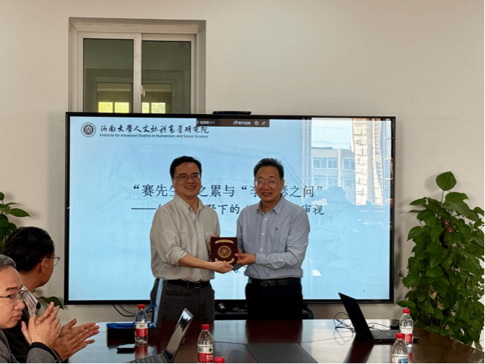 2026 年3月27 日下午,南强学术讲座在厦门大学南光楼317会议室举行。本次讲座特邀河南大学人文高等社会科学研究院院长、河南省历史学会会长张宝明教授主讲,主题为“‘赛先生’之累与李约瑟之问——知识史视野下的‘科学’再审视”,厦门大学历史与文化遗产学院张侃院长主持本次讲座,学院师生代表到场聆听。讲座开始前,主持人张侃院长代表厦门大学历史与文化遗产学院向张宝明教授赠送南强讲座纪念牌,以申谢忱。