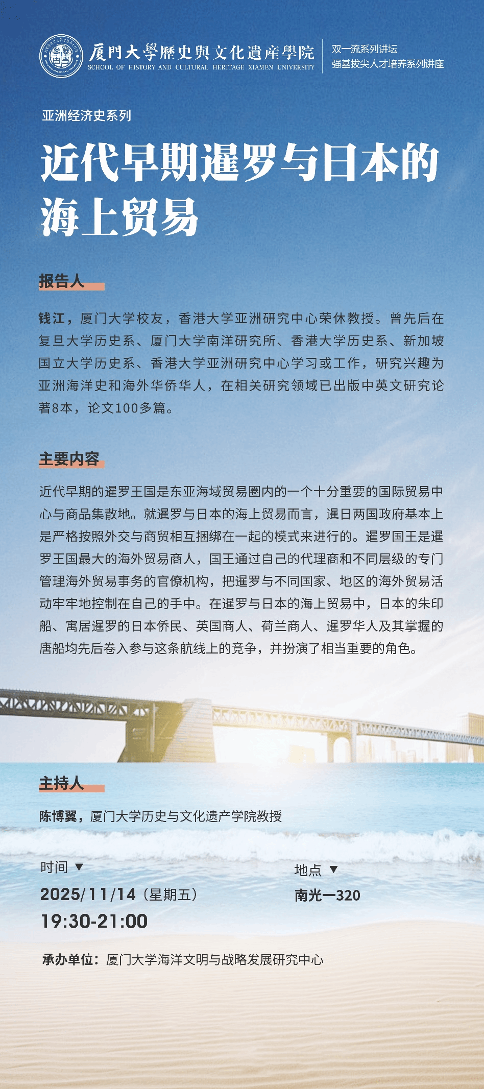2025年11月15日晚,应厦门大学历史与文化遗产学院邀请,香港大学亚洲研究中心荣休教授钱江在南光楼320室作主题为“近代早期暹罗与日本的海上贸易”的讲座。该讲座属于厦门大学历史与文化遗产学院“‘双一流’名家讲坛”暨“强基拔尖人才培养系列讲座”以及“亚洲经济史系列”第9讲,由陈博翼教授主持。
