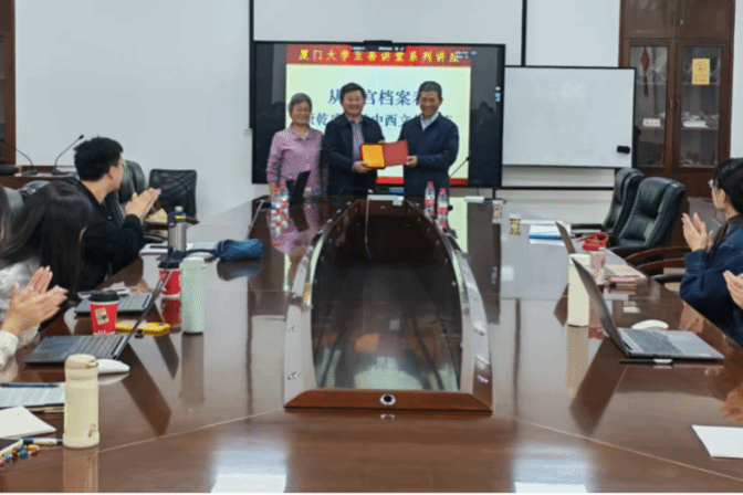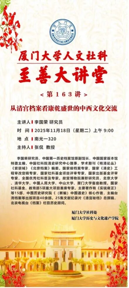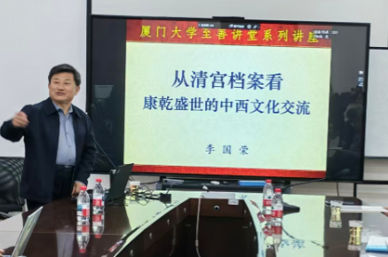 2025年11月18日上午,中国第一历史档案馆原副馆长、国家级档案专家李国荣研究员应邀来到厦门大学历史与文化遗产学院,在至善大讲堂为师生们带来《从清宫档案看康乾盛世的中西文化交流》专题讲座。李国荣研究员结合大量档案文献与精美的图片,展示了康雍乾时期繁盛的中西交流,他从康雍乾时期的对外国策、康雍乾时期朝廷的西洋人、康雍乾时期皇宫里的西洋器物、康雍乾时期中外频繁的往来等多个方面展现了清廷与世界的“别样风景”。