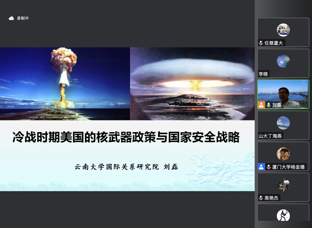 2022年9月29日晚19时,云南大学国际关系学院副院长刘磊教授受厦门大学历史系以及厦门大学美国研究中心之邀,通过腾讯会议作了题为《冷战时期美国的核武器政策与国家安全战略》的学术讲座。本场讲座系“厦大南强世界史”和”“强基拔尖人才”系列讲座,由厦门大学国际关系学院/南洋研究院高艳杰教授主持,来自厦门大学和全国各地的200多名听众参加了此次讲座。