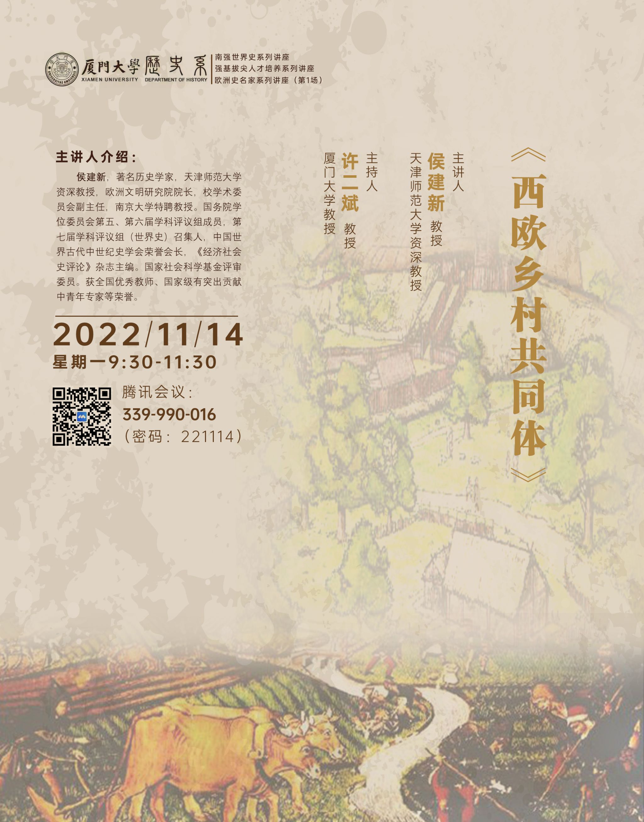 主讲人介绍:侯建新,著名历史学家,天津师范大学资深教授,欧洲文明研究院院长,校学术委员会副主任,南京大学特聘教授。国务院学位委员会第五、第六届学科评议组成员,第七届学科评议组(世界史)召集人,中国世界古代中世纪史学会荣誉会长,《经济社会史评论》杂志主编。国家社会科学基金评审委员。获全国优秀教师、国家级有突出贡献中青年专家等荣誉。
