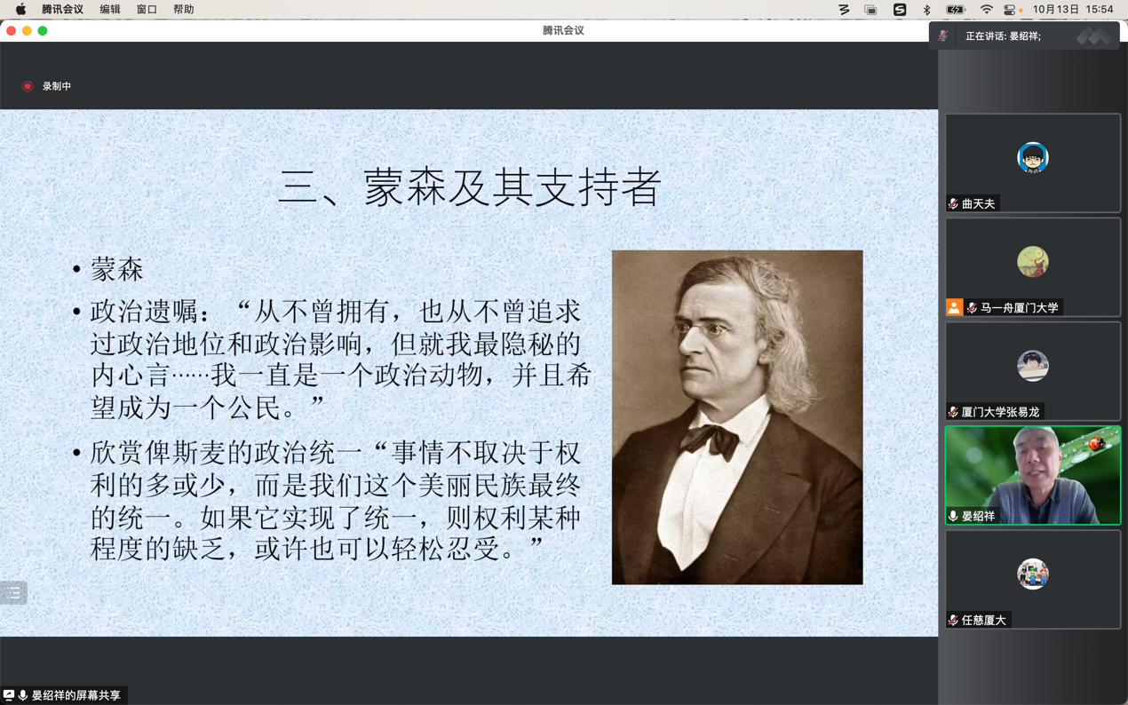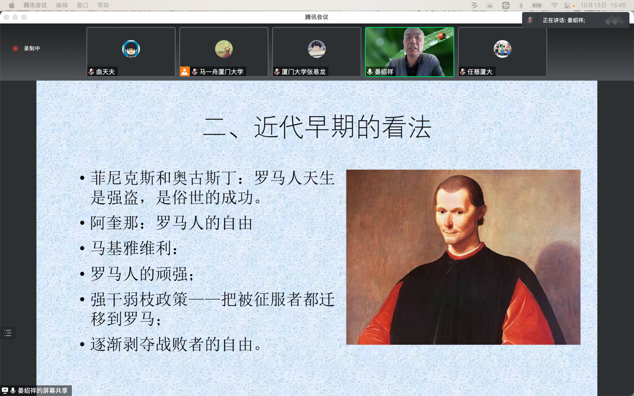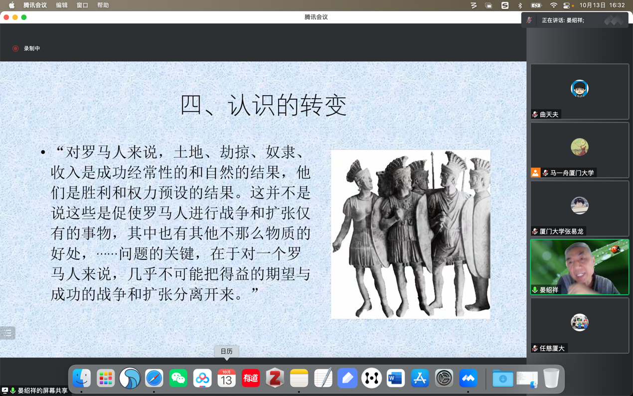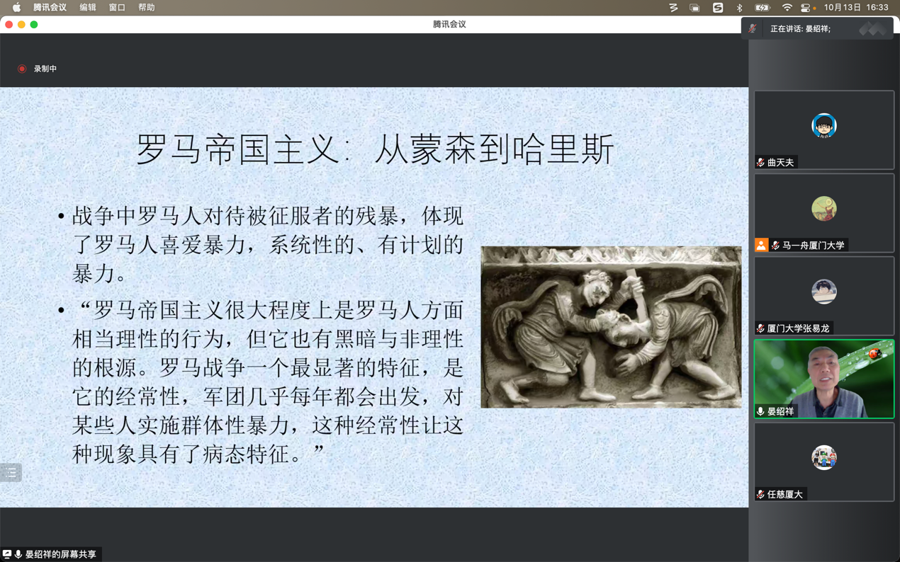 2022年10月13日厦门大学历史系“南强世界史系列讲座暨强基拔尖人才培养系列讲座”线上特邀首都师范大学晏绍祥教授以《罗马帝国主义:从蒙森到哈里斯》为题进行演讲。在讲座开始,晏绍祥教授首先厘清了“imperium”的含义,这一词汇在古罗马时期首先指的是官员的执行权。它在近代则被引申为帝国主义,指的是一种国家间的扩张行为。罗马从拉丁姆地区的一个小小城邦一跃成为横跨亚欧非三洲的帝国,这一戏剧性的历史事实历来吸引了许多学者的关注,罗马帝国的成因也自然就成了研究的重点。关于帝国主义有许多截然相反的定义,霍布森认为帝国主义是工业巨头力图用寻找国外市场和外国投资的办法来为自己剩余财富的洪流扩大通道的一种政策。列宁则将帝国主义定义为垄断资本主义发展到最高阶段的形式。上述对帝国主义的定义更多着眼于经济层面,它们更适用于近代西方殖民帝国,而非罗马这样的古代帝国。因此,也许王敦书、于可先生的定义与罗马的情况更为相符,他们认为:“在历史上,以一个国家和民族为主,通过征服或其他手段,建立起的包括属地、属国在内的多民族国家,就叫做帝国;帝国往往是,但并非一定是专制君主制的国家”。也就是说在共和国后期,罗马就已然可以被视为一个帝国。在对帝国主义概念介绍的基础上,晏老师还简单介绍了马克垚、刘津渝和王忠孝等著名学者的成果,使参与的同学能够在讲座后进一步扩展对罗马帝国主义的理解。
