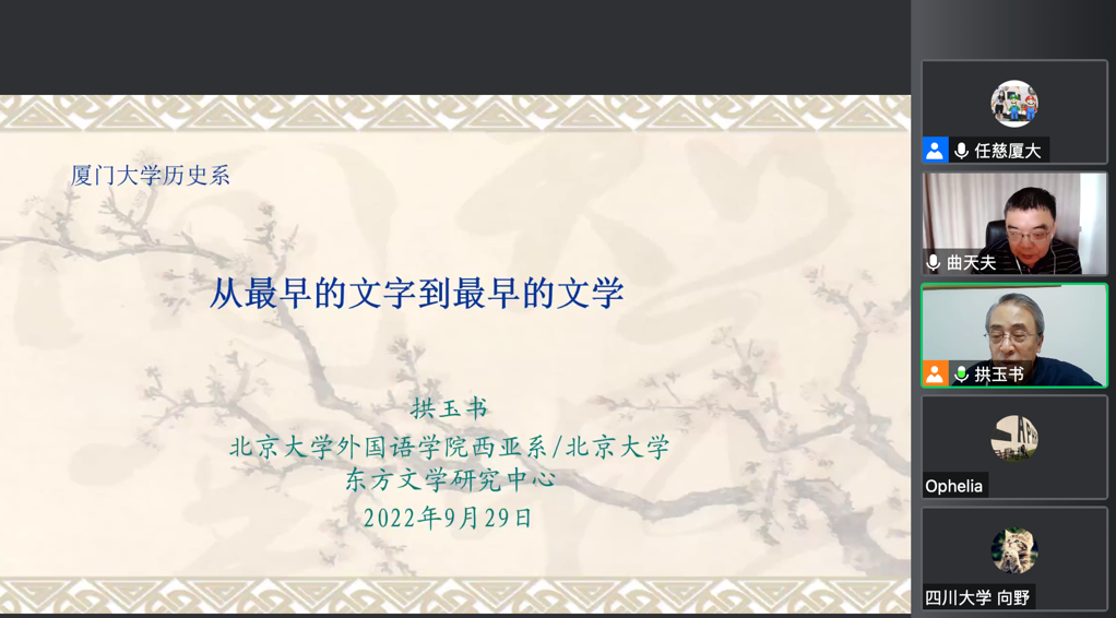 2022年9月39日厦门大学历史系“南强世界史系列讲座暨强基拔尖人才培养系列讲座”线上特邀北京大学外国语学院西亚系拱玉书教授以《从最早的文字到最早的文学》为题进行演讲。讲座伊始,拱玉书教授先对本次讲座的主要对象——楔形文字文明的时空范围加以介绍:公元前3200年,于美索不达米亚、古希腊语“两河之间”、亦即今天伊拉克南部诞生了世界上已知最早的文字体系,这一书于泥板的楔形文字文明传承数千载之久,历经早王朝、阿卡德王国、乌尔第三王朝、巴比伦及亚述诸政权而兴盛不衰,波斯征服后虽逐渐衰落,但仍不绝如缕、直至公元后74年仍有泥板出土,此后方才“寿终正寝”。然而,回到文字诞生之初,彼时虽有词汇,但无篇章,文字之用,大抵记录账目、罗列名单;及至文学滥觞,楔文书写系统才真正臻于完善。由此,本次讲座便正式围绕两大主题——“最早的文字”与“最早的文学”加以展开:前者介绍楔文发展源流、古人文字起源传说、今人文字起源理论以及楔文同汉字的共通之处——基于“许慎六书”加以类比;后者则介绍不同时期的代表文学作品,并以苏美尔语、阿卡德语的各自吉尔伽美什史诗系列为例进行个案分析,帮助听众一窥两河文学之堂庑。