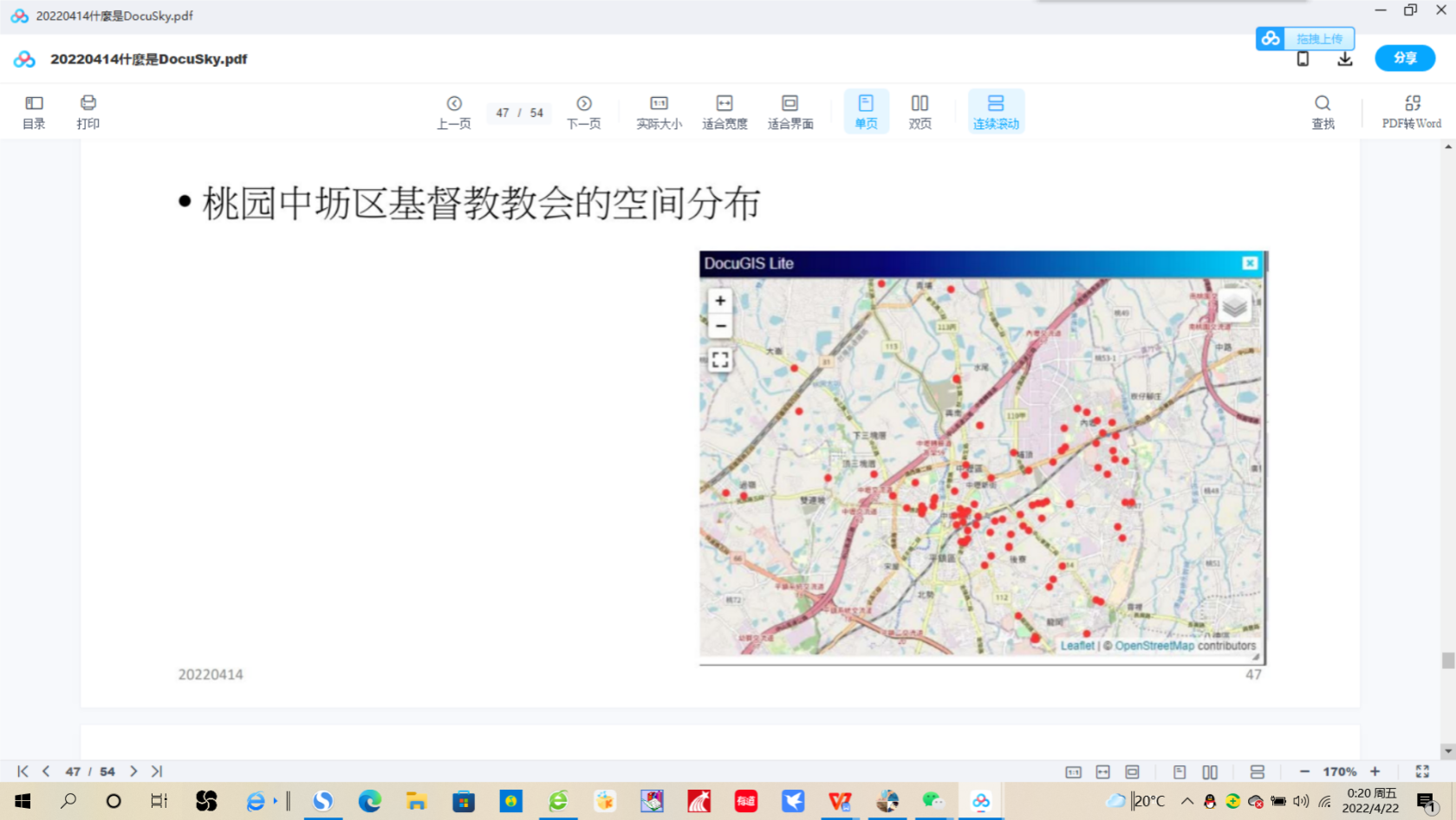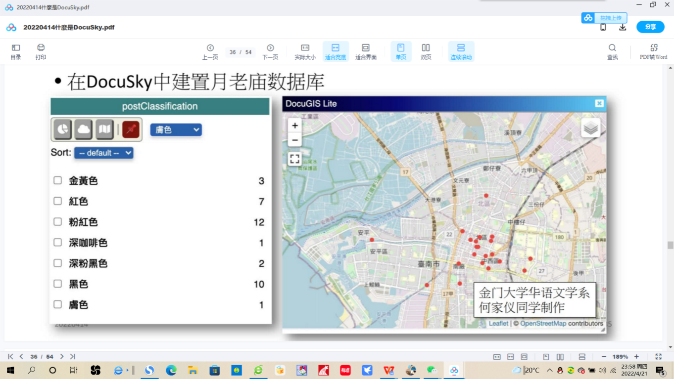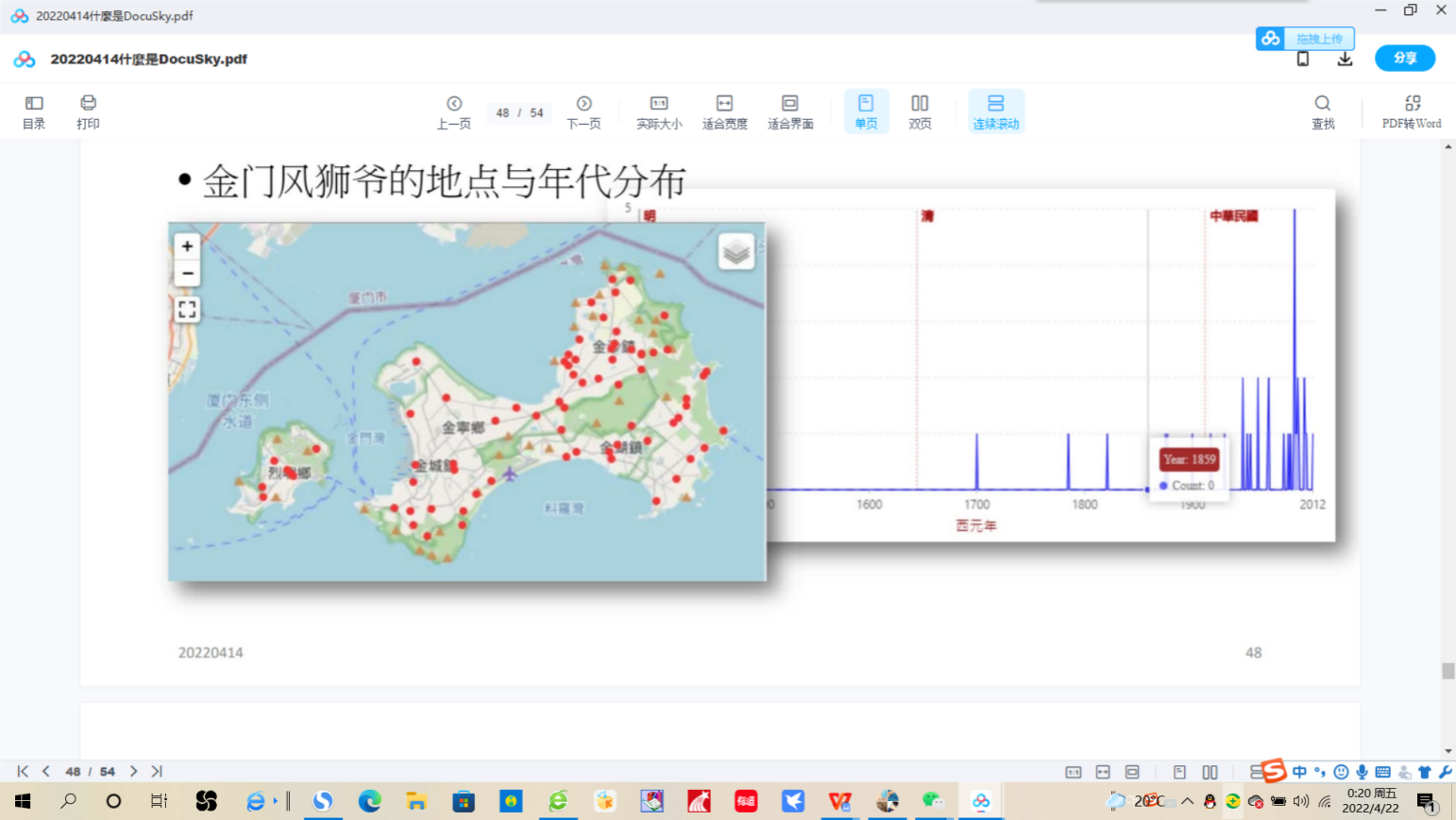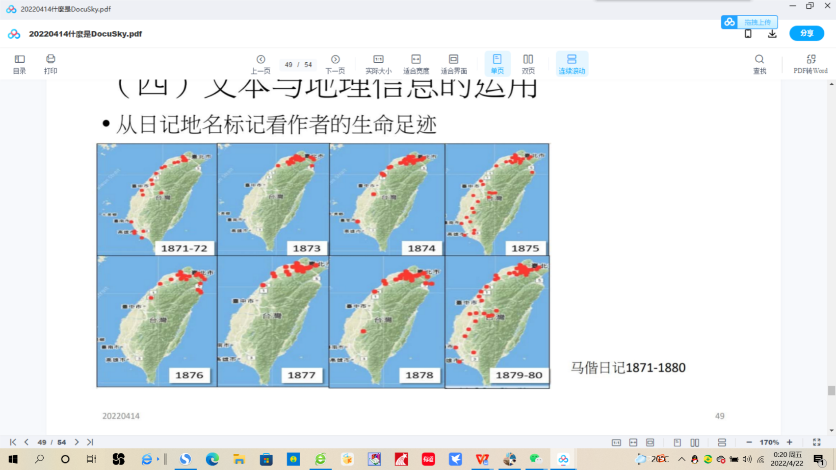 在文本与地理信息的运用方面,胡其瑞首先将台湾“中研院”文化资源地理信息系统所收录的台湾部分宫庙数据制作为EXCEL表格,并将该表格信息通过DocuGIS工具呈现在地图上,以此示范DocuGIS的基本功能。而后胡其瑞又展示了利用DocuGIS所做的台湾桃园中坜区基督教会的分布、福建金门风狮爷的时空分布、马偕日记作者的生命足迹、《大唐西域记》地名的坐标位置与文本互动等四项研究。这些范例说明了在研究中我们可利用DocuGIS工具展现资料中地理信息的脉络关系。