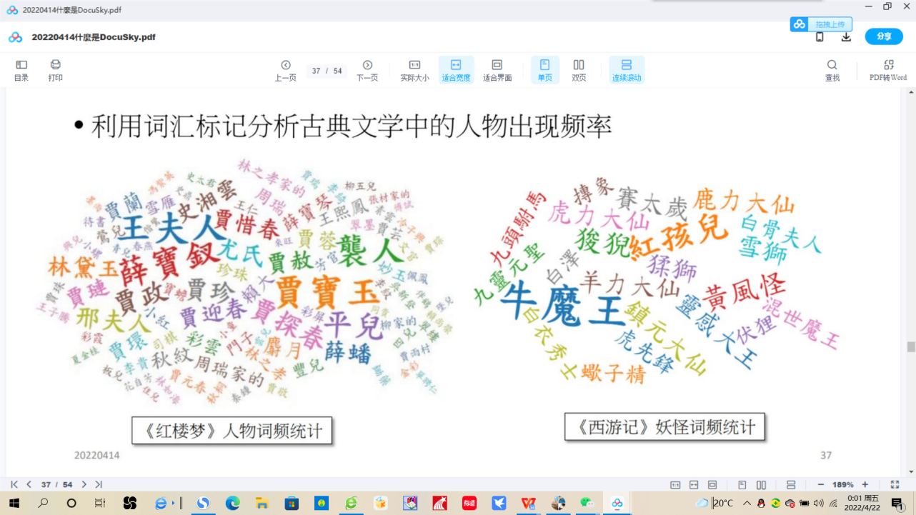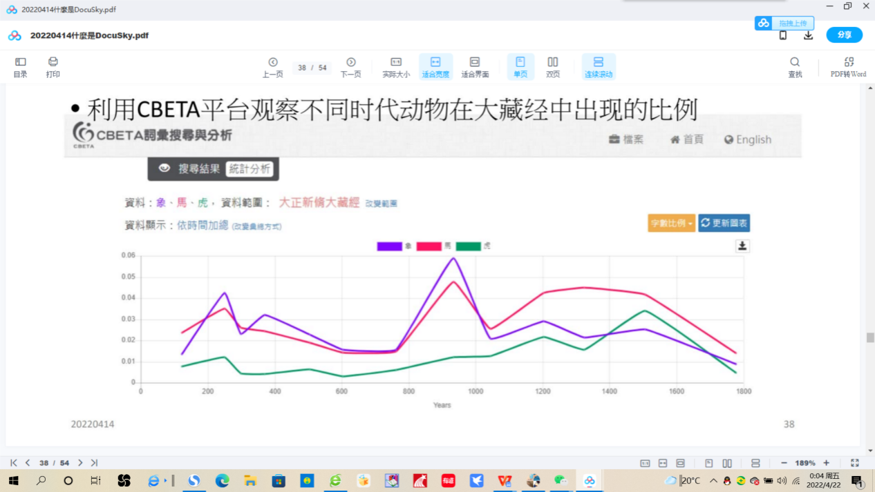 第二个常用功能为文本与词汇统计分析功能。胡其瑞利用词汇标记工具分析《红楼梦》、《西游记》中的人物和妖怪出现频率,并指出出现频率较高的词汇可以反映作者的某种想法。接着胡其瑞利用CBETA平台统计功能统计不同时代动物在大藏经中出现的频率,并提醒我们这可以反映翻译者所接触的世界,有助于启发我们的研究。最后,胡其瑞又以福建金门传统民间文书资料库为例,说明了研究者可以利用词汇标记统计功能对文献中出现的人物进行分析研究。