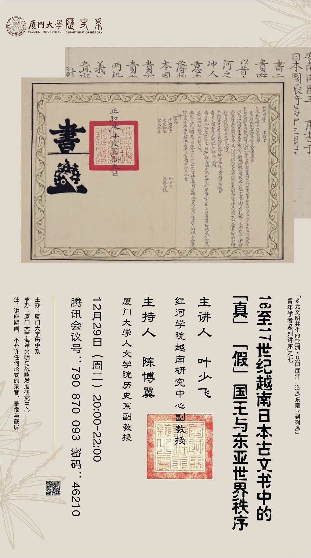 2020年12月29日晚,红河学院越南研究中心副教授叶少飞老师应厦大历史系之邀,通过腾讯会议室做了题为《十六至十七世纪越南日本古文书中的“真”“假”国王与东亚世界秩序》的学术讲座。本场讲座由厦门大学历史系陈博翼老师主持,系厦门大学历史系主办“多元文明共生的亚洲:从印度洋、海岛东南亚到列岛”青年学者系列讲座第七场。下面,本文将分六部分记述本次讲座的主要内容。