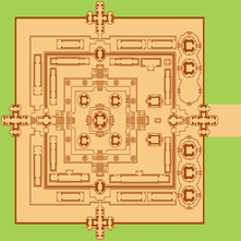 第一种模拟即是在寺庙建筑的四方形平面上的模拟。在印度雅利安文化中,四方形代表的是天界的形状。根据古印度文献《广集》,四方形在空间意义上最为广阔,在时间上,先于一切造物出现,是最富于创造力也最富于神圣性的符号。而且根据古印度建筑论的说法,四方形本身也是一种特权象征。