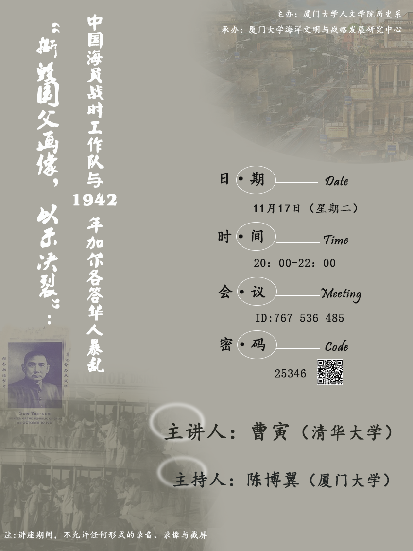 本次讲座将以1942年于印度加尔各答成立的中国海员战时工作队为中心,探讨国民政府在抗战期间的国家建构计划,英印政府的殖民主义焦虑,以及华人水手的“不被统治的艺术”。本研究最终试图呈现中国国民政府对于在印华人水手的规训以及华人水手的反抗如何引起了英印殖民政府的地缘政治焦虑,而这一焦虑继而被独立后的印度政府所继承,因此为1950年代后的中印关系奠定了基调。总体而言,本讲座将为我们理解当下中印冲突提供一个不同于以往的解释角度。