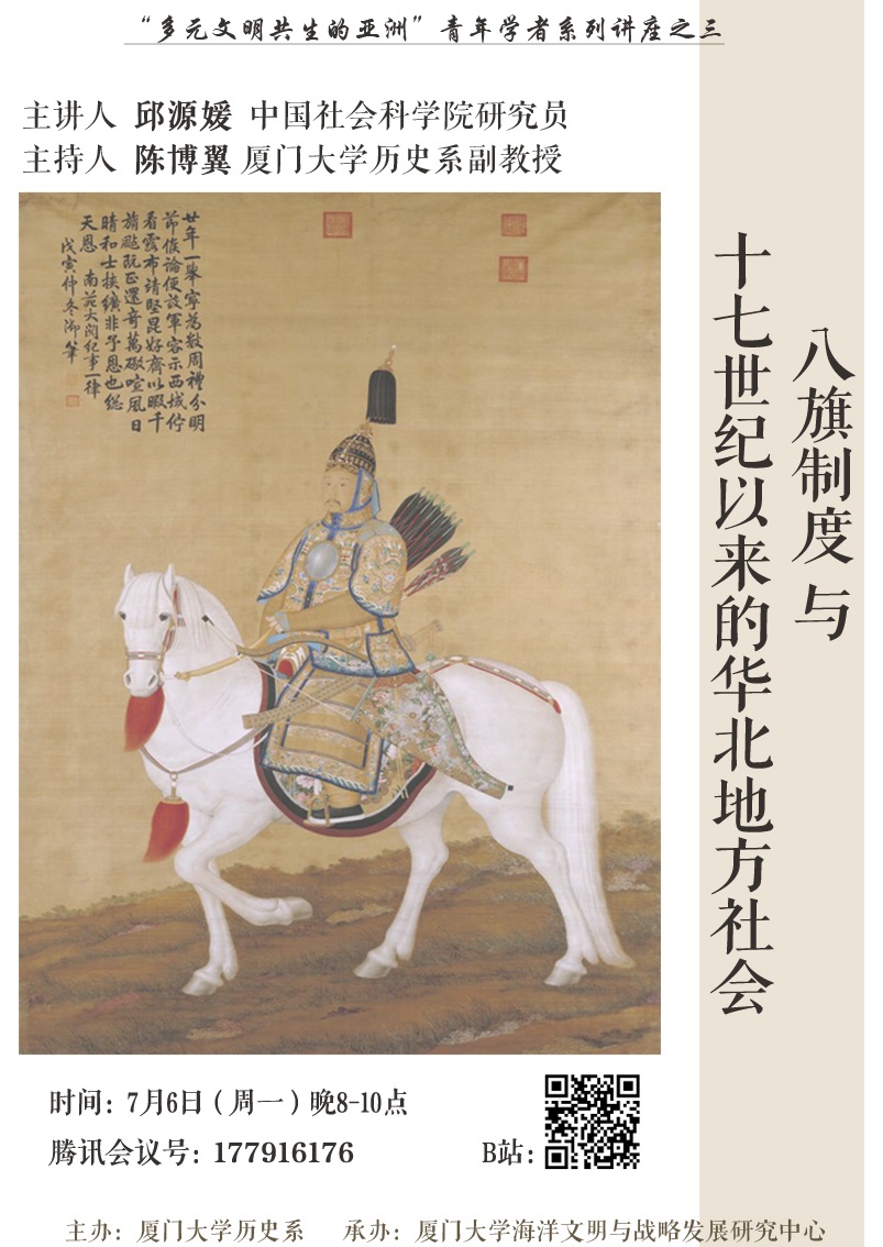 主讲人简介:邱源媛,历史学博士,中国社会科学院古代史研究所研究员,哈佛大学东亚系访问学者。研究专业为清史、社会史,研究方向八旗制度、旗人社会、华北区域史。主要著述《清前期宫廷礼乐研究》(2012)、《找寻京郊旗人社会——口述与文献双重视角下的城市边缘群体》(2014)、《近畿五百里——清代畿辅地区的旗地与庄头》(2016,合作),并在《中国史研究》、《清史研究》、《历史档案》等杂志发表论文二十余篇。